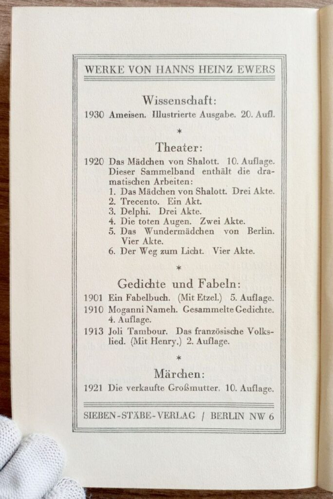 Издание 1928 года было выпущено Sieben-Stabe-Verlag (Издательство «Семь Жезлов») в Берлине. Это издательство специализировалось на публикации произведений самого Эверса и другой литературы подобного толка, что видно из рекламных страниц в конце тома, где приведен почти полный корпус его сочинений: от «Ученика чародея» (1909) и «Вампира» (1920) до пьес и стихов. Указание на большие тиражи (60-е, 80-е издания) говорит о невероятной популярности автора в Веймарской Германии.