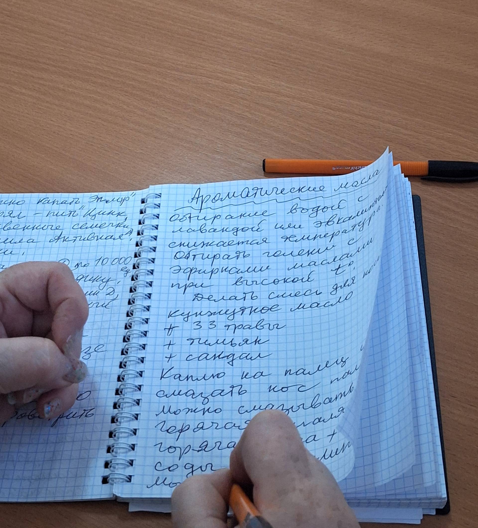 Самые основные масла, используемые при вирусных инфекциях — чайное дерево, эвкалипт, тимьян, лаванда, лимон и другие — вдыхали прямо на мастер-классе и обсуждали способы их применения при ингаляциях, нанесении на кожу, в качестве приёма внутрь, в сочетании с вакуумными банками и водными процедурами.