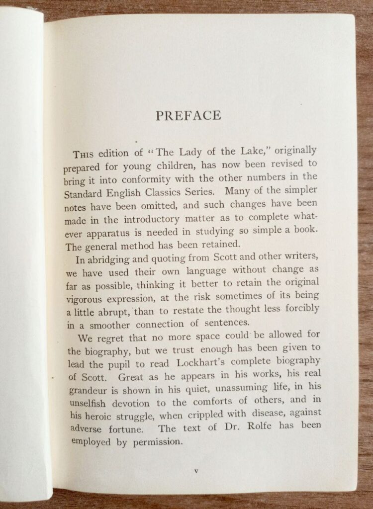 Сегодня отдел иностранной литературы представляет классический образец образовательной литературы начала XX века — поэму «The Lady of the Lake» сэра Вальтера Скотта (Walter Scott, 1771–1832) в составе академической серии Standard English Classics. Это издание 1917 года, выпущенное бостонским издательством Ginn and Company, демонстрирует, как литературная классика адаптировалась для учебных целей в эпоху массового образования, а также отражает историю восприятия шотландского наследия в англоязычном мире.