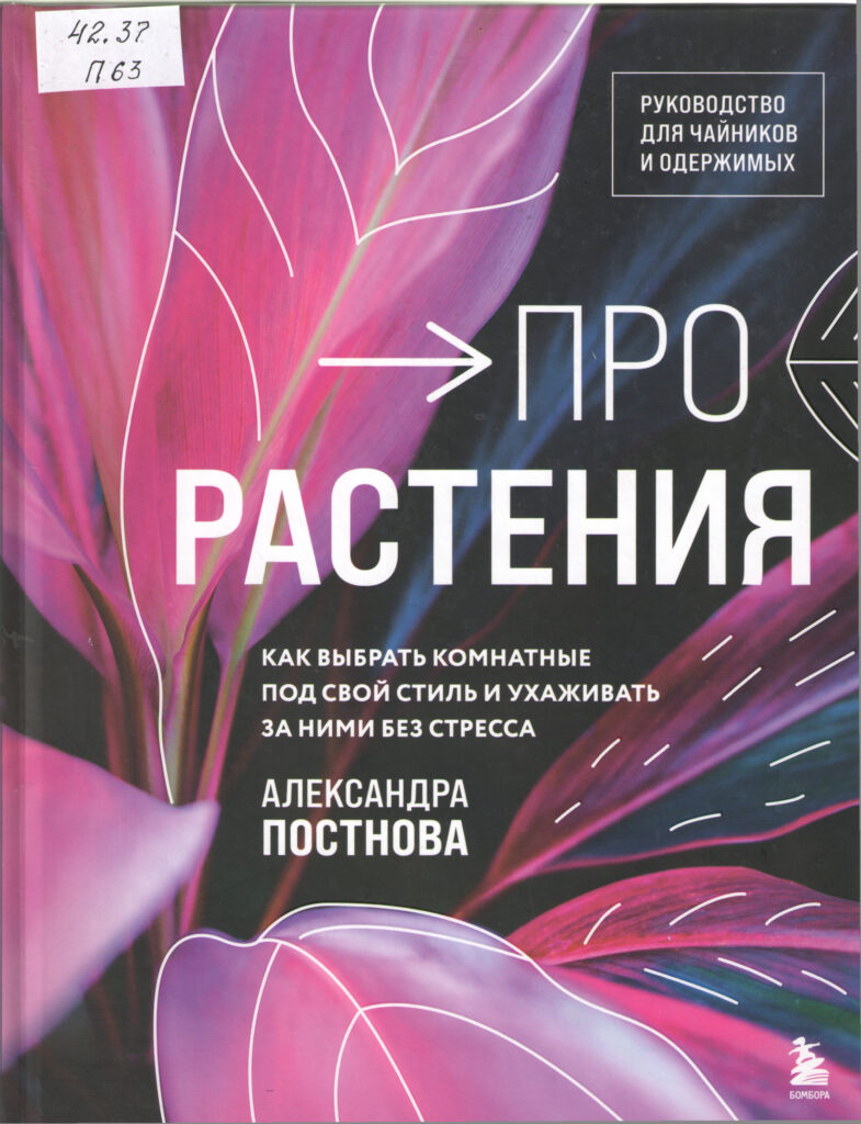 Постнова, Александра Романовна. Про растения : как выбрать комнатные под стиль и ухаживать за ними без стресса / Александра Постнова. — [Б. м.] : Эксмо : Бомбора, 2024. — 205, [1] с. : цв. ил. ; 25 см. — (Флорариум: новые тренды в озеленении интерьера) (Руководство для чайников и одержимых). — 2000 экз. — ISBN 978-5-04-192116-3 (в пер.).