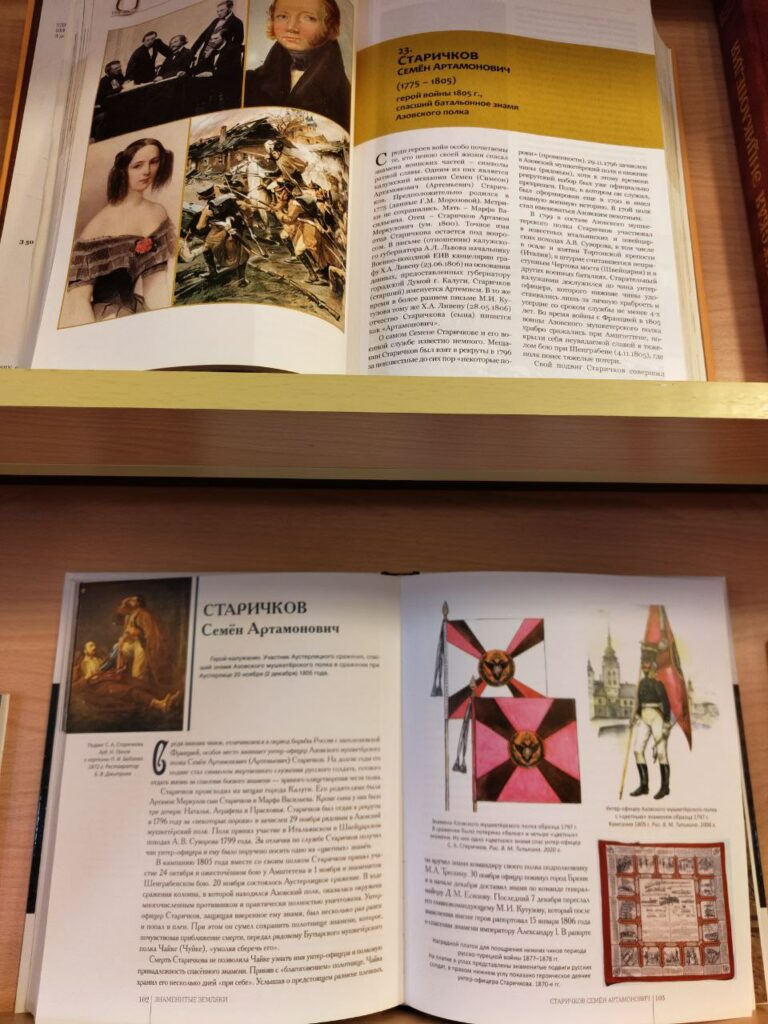 В Краеведческо-информационном центре открыта книжно-иллюстративная выставка «Герой – калужанин Семён Старичков» к 220-летию его подвига. 2 декабря 1805 года состоялась битва под Аустерлицем, вошедшая в иcторию как «битва трёх императоров»: союзников — русского императора Александра I и австрийского императора Франца I – против армии Наполеона. В этом сражении союзники потерпели поражение. Россияне тяжело переживали это поражение.