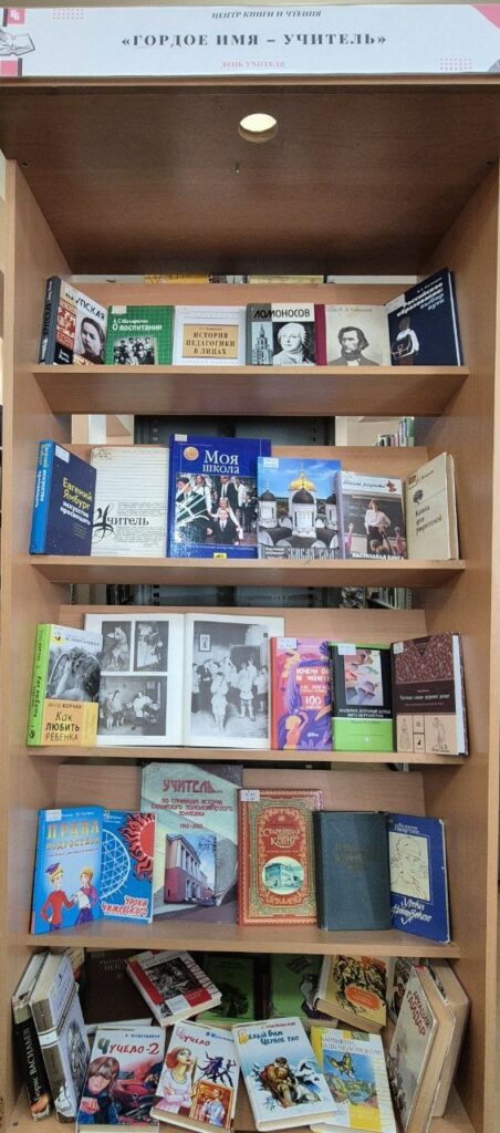 Ко Дню учителя Центром книги и чтения оформлена выставка «Гордое имя – учитель». На выставке представлены материалы, которые освещают историю педагогики, а также художественные произведения русских и советских авторов о школе, учениках и личности учителя.