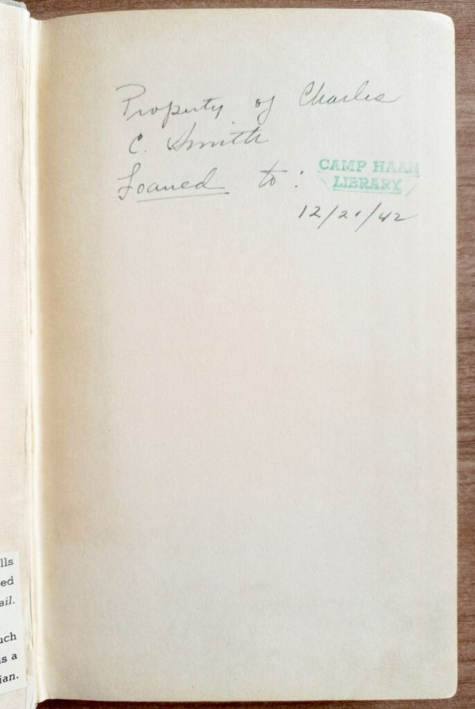 Camp Haan Library, куда была передана книга, скорее всего, находилась в одном из многочисленных учебных или тренировочных лагерей Армии США. Лагерь Хаан, расположенный в Калифорнии, был создан в 1941 году и использовался для подготовки солдат, включая тренировки по стрелковому делу, физической подготовке и медицинской помощи. Лагерь также служил временным пристанищем для солдат, ожидающих отправки на фронт.