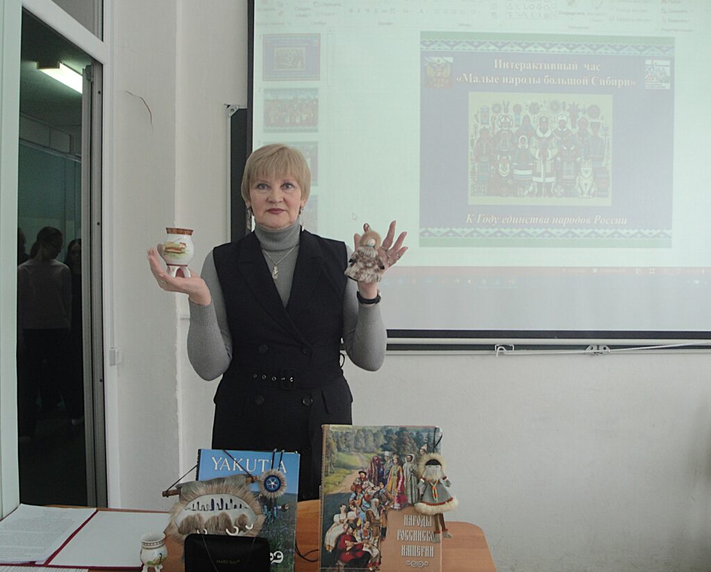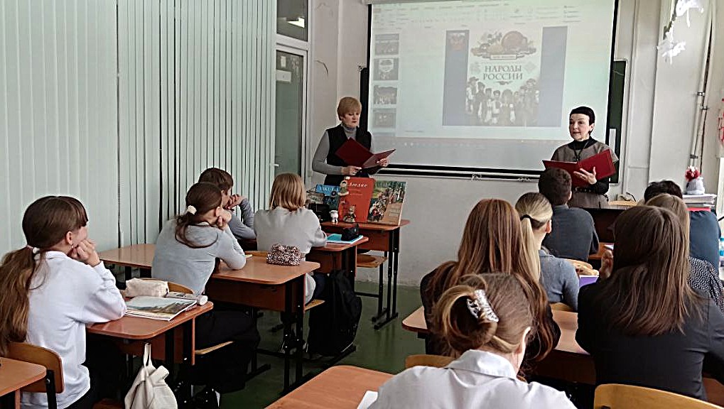 В рамках реализации просветительского проекта «Многонациональная Россия: изучаем прошлое – бережём настоящее», разработанного с учетом Года единства народов России, сотрудники библиотеки посетили МБОУ «СОШ №18 г. Калуги», где для учащихся 7 «Б» и 7 «В» классов были проведены интерактивные классные часы на темы «Народов много – Родина одна» и «Малые народы большой Сибири».