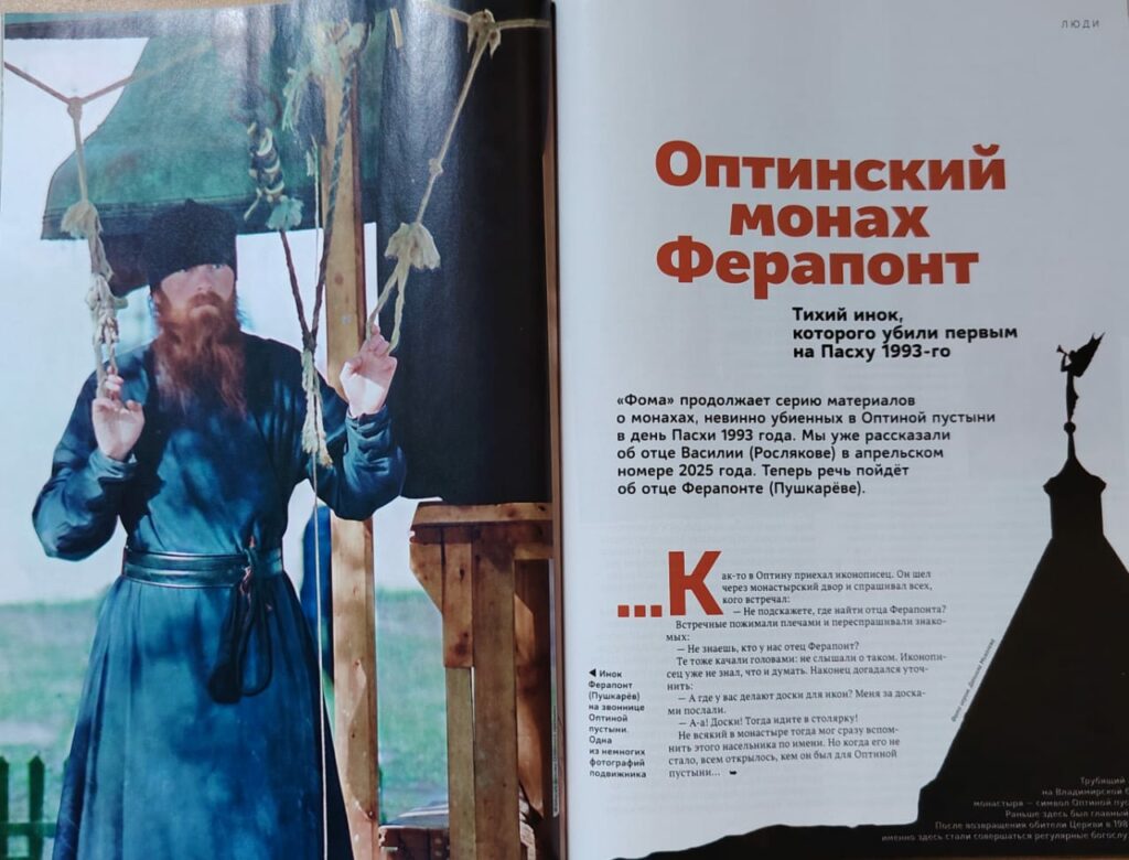 Утром 18 апреля 1993 года, в светлое утро Пасхи в Оптиной пустыне были убиты три монаха – иноки Ферапонт (Пушкарев) и Трофим (Татарников) и иеромонах Василий (Росляков). Журнал «Фома» продолжает серию материалов о невинно убиенных. В апрельском номере рассказывали об отце Василии (Рослякове). В этом номере речь пойдет об отце Ферапонте, тихом иноке, которого убили первым. Отец Ферапонт (в миру — Владимир Пушкарев) вырос в Сибири, работал лесником. В обители послушник занимался резьбой по дереву и плотничал. У него было неодолимое желание жить с Христом, от него исходила благодать молчания. Братья потом вспоминали последние слова Ферапонта, сказанные за считанные часы до гибели и приобретшие потом новый смысл. «Как хорошо здесь на святой Оптинской земле! Мне, почему то хочется, чтобы эта Пасха была вечной и не заканчивалась никогда».