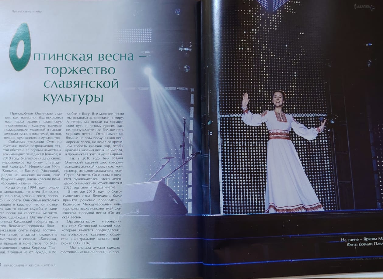 Преподобные оптинские старцы благословляли наш народ хранить славянскую письменность и культуру. Соблюдая традиции Оптиной пустыни после возрождения святой обители, её первый наместник архимандрит Венедикт (Пеньков) велел собрать казачий хор, чтобы казачья песня продолжала жить в душе народа. Так, в 2010 году был создан Оптинский казачий хор, который возглавил поэт, композитор и исполнитель Сергей Матвеев. Он и поныне является руководителем этого легендарного коллектива. В том же году по благословению отца Венедикта было принято решение ежегодно проводить в Козельске Международный конкурс-фестиваль исполнителей славянской народной песни «Оптинская весна». Цель фестиваля – объединение славян под стягом Православия.