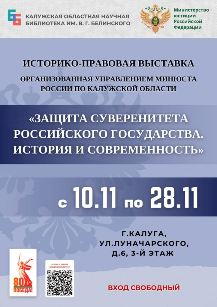 В Государственном бюджетном учреждении культуры Калужской области «Калужская областная научная библиотека им. В.Г. Белинского» открывается историко-правовая выставка «Защита суверенитета Российского государства. История и современность», организованная Управлением Минюста России по Калужской области.