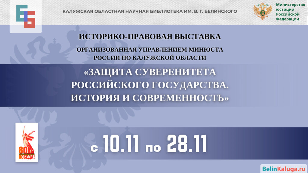 В Государственном бюджетном учреждении культуры Калужской области «Калужская областная научная библиотека им. В.Г. Белинского» открывается историко-правовая выставка «Защита суверенитета Российского государства. История и современность», организованная Управлением Минюста России по Калужской области.