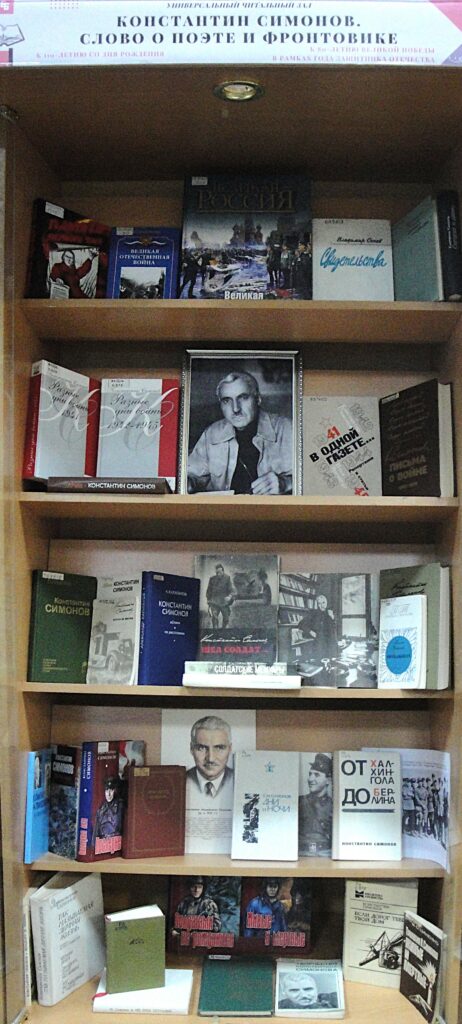Дорогие друзья! В Калужской областной научной библиотеке им. В.Г. Белинского работает книжная выставка «Константин Симонов. Слово о поэте и фронтовике», подготовленная к 110-летию со дня его рождения, а также с учетом текущего Года защитника Отечества. В экспозиции представлен материал, рассказывающий о жизненном и творческом пути писателя и поэта, литературоведческие исследования, воспоминания его современников, его многогранное творчество.