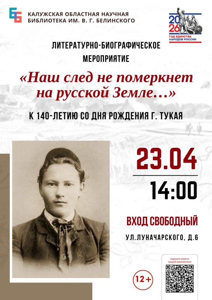 23 апреля в библиотеке пройдет литературно-биографическое мероприятие «Наш след не померкнет на русской земле…», подготовленное к 140-летию со дня рождения Г. Тукая.