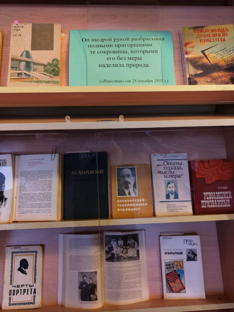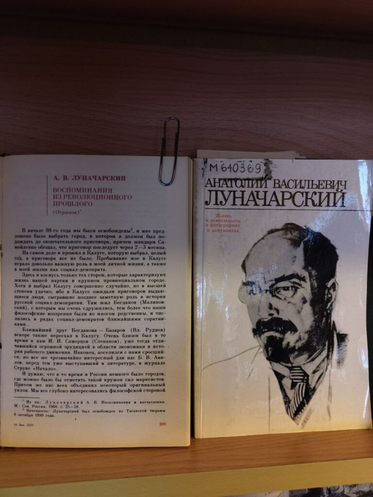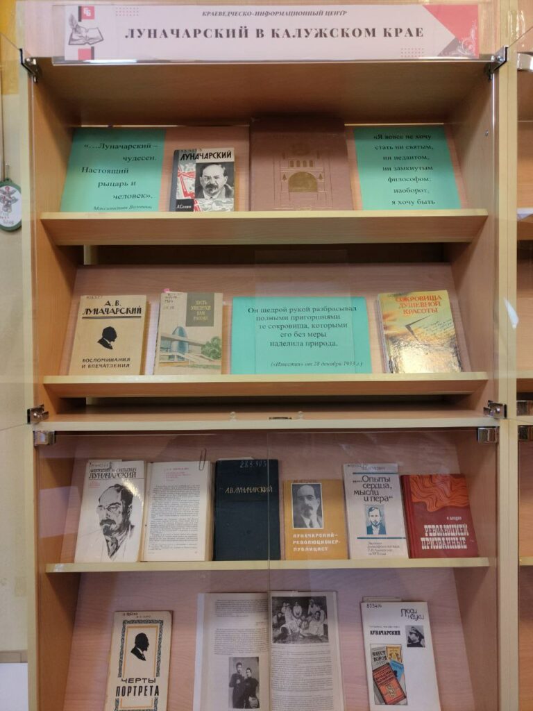 23 ноября в Краеведческо-информационном центре открылась книжно-иллюстративная выставка «Луначарский и Калужский край»: к 150-летию со дня рождения Анатолия Васильевича Луначарского (1875-1933) – первого наркома просвещения РСФСР, писателя, теоретика искусства, публициста, драматурга, философа. Существенной страницей в политической биографии Луначарского оказалось пребывание в Калужском крае.