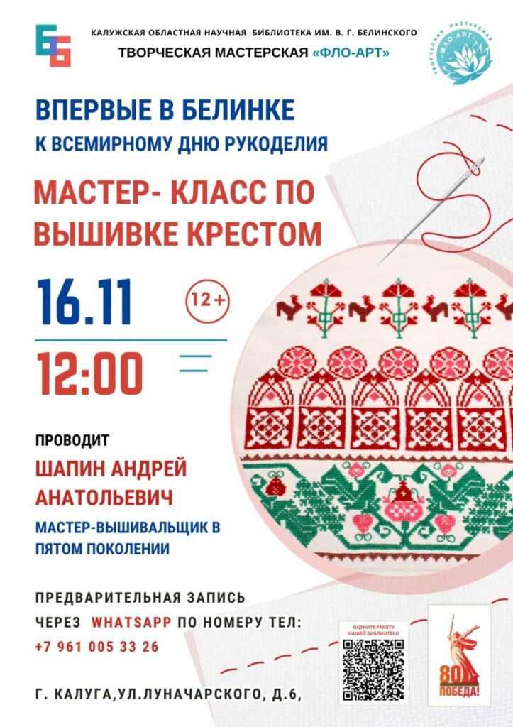 В этот день мы приготовили для вас целую творческую программу!Помимо участие в свободном эко-обмене «Кусочек» от Анны Тюиной и мастер-классе по работе с фоамираном (кто успел записаться), у вас есть уникальная возможность познакомиться с техникой традиционной Калужской вышивки крестом!Мастер-класс проведёт Андрей Шапин — мастер-вышивальщик в пятом поколении!