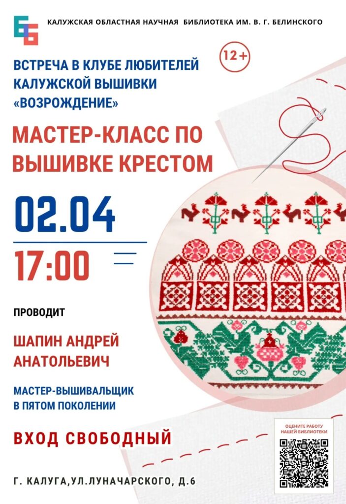 2 апреля в 17:00 в Калужской областной научной библиотеке имени В. Г. Белинского пройдёт мастер-класс по традиционной технике вышивки крестом. Мероприятие организовано клубом любителей калужской вышивки «Возрождение». Ведущим мероприятия выступит Андрей Анатольевич Шапин, признанный мастер и глубокий исследователь данного ремесла.