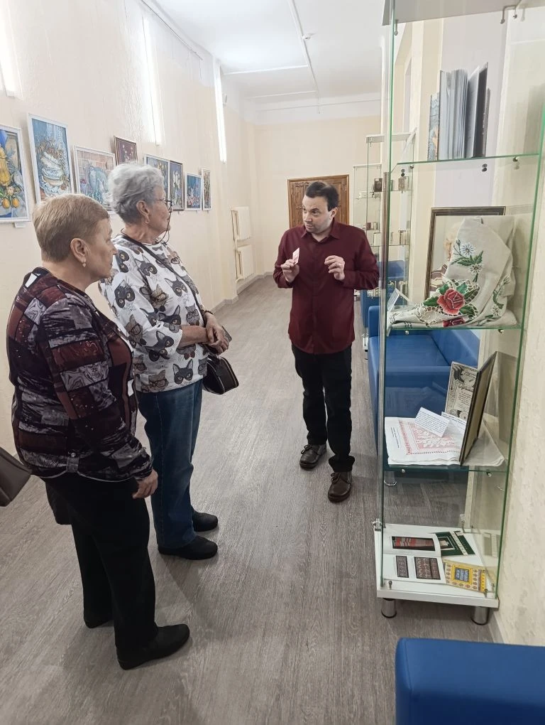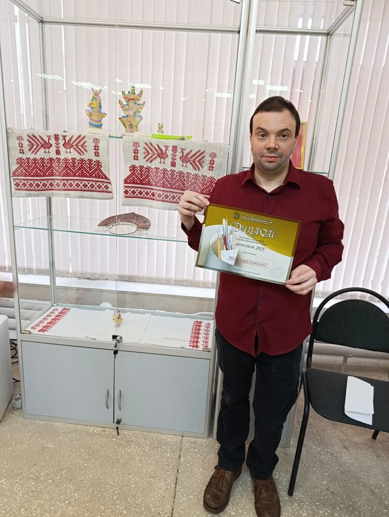 Кроме этого, участники клуба узнали, что Андрей Шапин был удостоен Диплома участника областной художественной выставки, где его работа «Традиционный праздничный рушник «Павлины» (2025), созданная в технике счетного креста, заняла достойное место. 3 марта в Калуге, в выставочном зале Дома художников, прошло торжественное награждение победителей ежегодного конкурса регионального Союза художников. В конкурсе приняли участие 90 авторов, включая 47 членов Союза художников России и представителей творческого сообщества. На суд зрителей и жюри было представлено более 150 работ: от живописных полотен и графических произведений до скульптур и предметов декоративно-прикладного искусства.