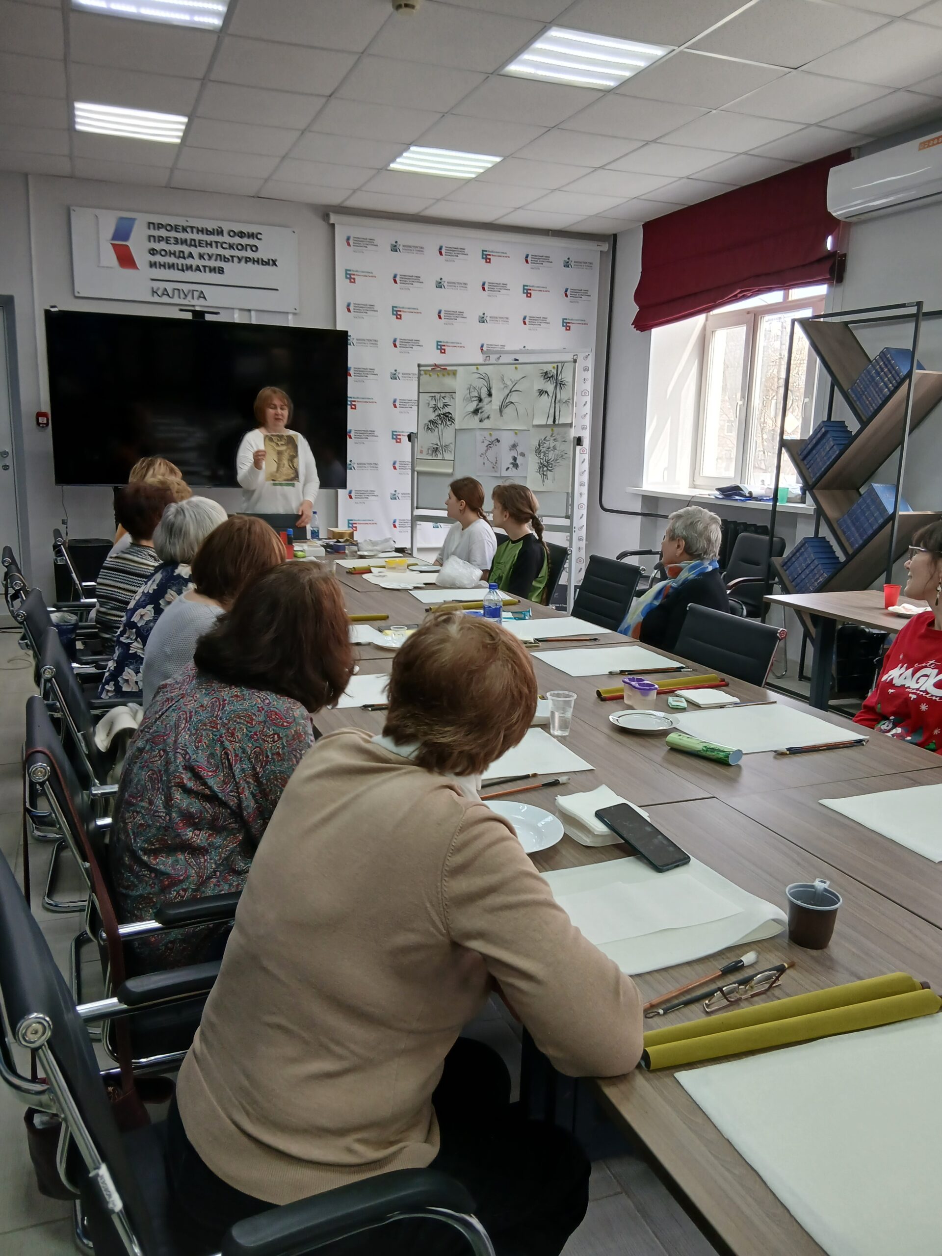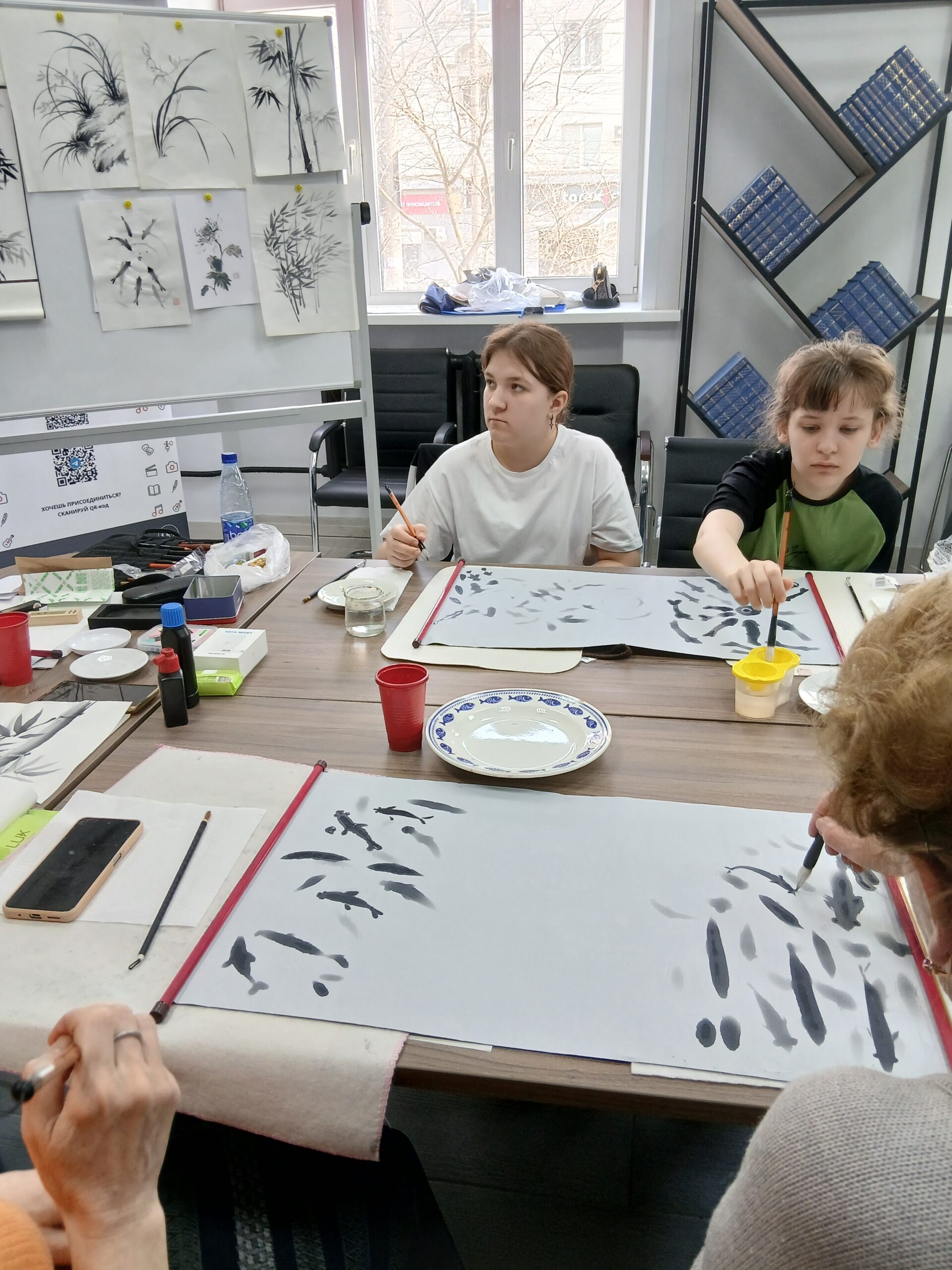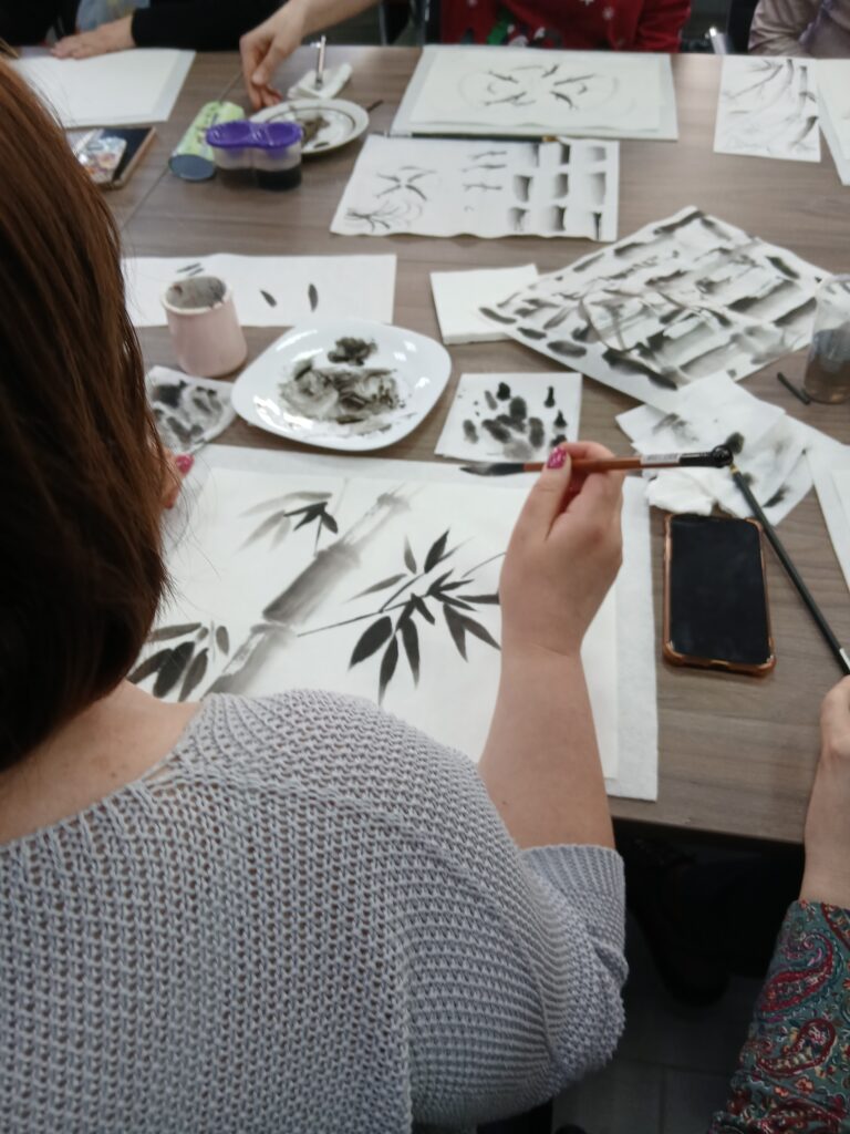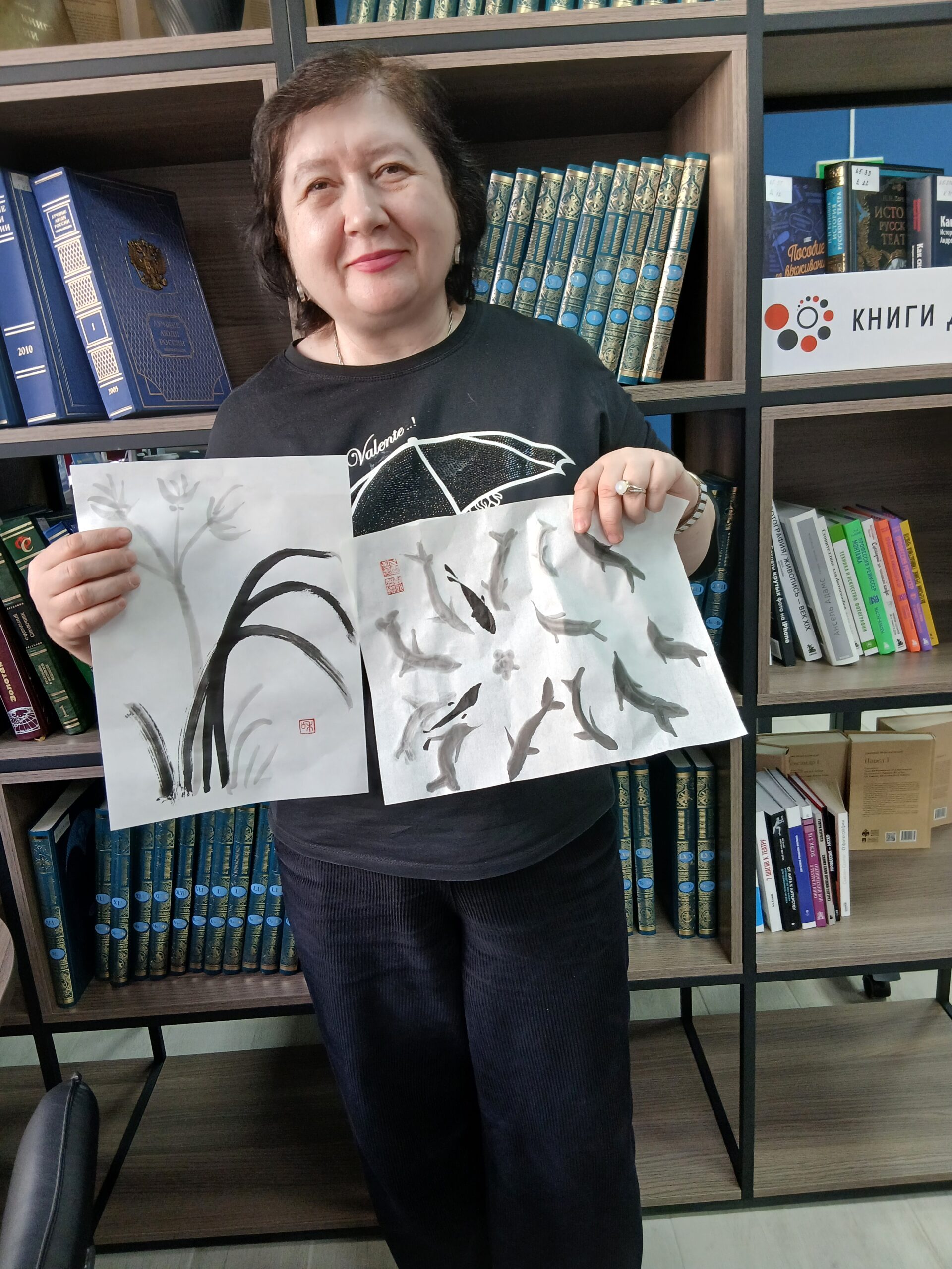 В библиотеке прошел мастер-класс Балиной Натальи «Японская живопись суми-э». Наталья Викторовна – профессиональный художник, член творческого союза художников восточной живописи, а также прекрасный преподаватель. Она увлекательно рассказала о технике работы с традиционными японскими материалами – рисовой бумагой, тушью, кистями для каллиграфии. В приятной творческой обстановке с помощью одной лишь черной туши участники мастер-класса рисовали простые композиции с бамбуком, орхидеями, тюльпанами и рыбками. Каждый участник подписал свою работу в восточной манере — красной печатью.