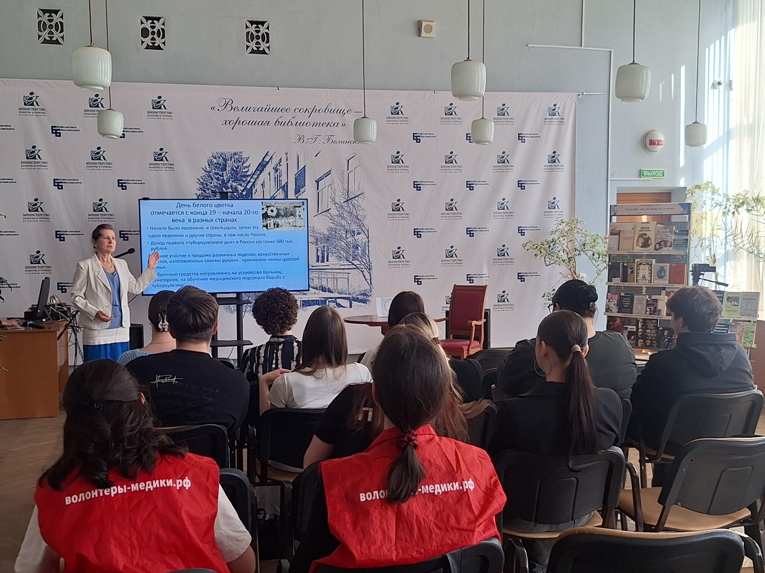 Вокруг этого трогательного и нежного цветка строилась вся обширная и разнообразная программа мероприятия. Книжная выставка «Болезнь, не знающая границ» рассказала об истории возникновения данного праздника и участии в нем членов семьи последнего российского императора Николая II, а также об известных писателях, художниках и музыкантах, страдавших этой болезнью и о литературных произведениях, герои которых болеют туберкулезом и чаще всего, умирают о него.