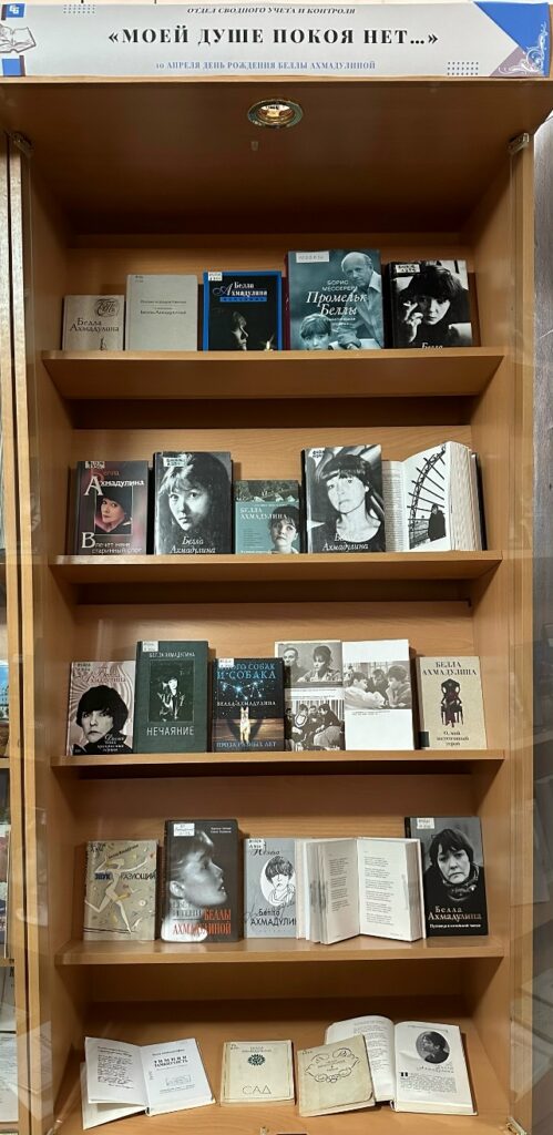 Жизнь Ахмадулиной в поэзии многие воспринимают как чудесный миф, созданию которого способствовали и её стихи, и её таинственный облик, и её голос, который заслуживает особого внимания. В России вышло более 30 её поэтических сборников. На выставке представлены книги Б. Ахмадуллиной из фонда библиотеки: «Метель» (1977), «Свеча» (1977), «Тайна» (1983), «Сад» (1987), «Стихотворения» (1988), «Миг бытия» (1997), «Нежность» (2013), «Поэзия народов Кавказа в переводах Беллы Ахмадулиной» (2007), и многие другие издания прекрасной российской поэтессы.