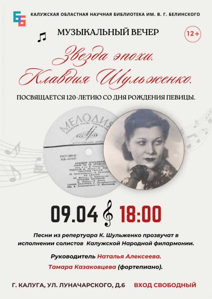 9 апреля в музыкальной гостиной библиотеки им. Белинского состоится вечер, посвященный великой певице. В ходе вечера прозвучит рассказ о ее жизни и творчестве и самые знаменитые песни из репертуара Шульженко: «Возьми гитару» (А. Лепина – М. Пляцковского), «Молчание» (И. Дунаевского – М. Матусовского), «Ваша записка» (Н. Бродского – П. Германа) и многие другие.