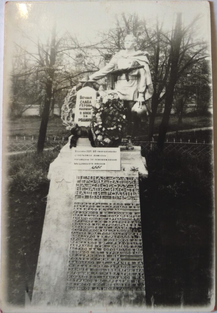 Позже перед стелой была установлена мемориальная плита с надписью: «Воинам 325-й 90-й гвардейской стрелковой дивизии, погибшим за освобождение Мещовского района» и мемориальная плита с надписью: «Вечная слава героям, павшим за свободу и независимость нашей Родины в 1941 – 1945 гг.» и фамилиями захороненных воинов. На мемориальной плите были занесены 47 фамилий воинов, погибших при освобождении города Мещовска. С обеих сторон мемориальной плиты были установлены макеты Орденов Великой Отечественной войны. Со временем вся территория могилы была окружена металлической оградой размером 6 на 5 метров. Внутри ограды росли четыре ели, с наружной стороны – липы. Дорожка к братской могиле была покрыта асфальтом.