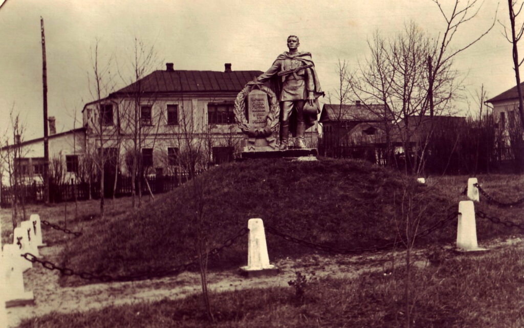 В 1952 году над могилой был сооружён земляной холм пирамидальной формы, обложенный дёрном. На вершине холма на двухступенчатом постаменте был установлен памятник-стела, увенчанный пятиконечной звездой. На стеле – изображение лаврового венка. Рядом – скульптурная фигура воина в плащ-накидке, с обнажённой головой, с автоматом на груди и каской в левой руке. Правая рука воина лежит на венке. Скульпторы: Антропов и Тамм. На стеле надпись: «Вечная слава героям, павшим в боях за Родину».