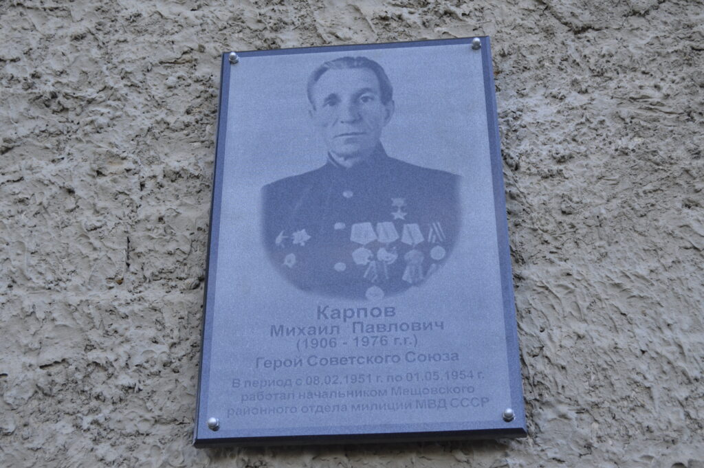 При содействии сотрудников органов внутренних дел и районной Администрации на здании отдела полиции города Мещовска было увековечено имя Героя Советского Союза Михаила Павловича Карпова. Его жизненный и трудовой путь тесно связаны с Мещовской землёй. Тем более что он является единственным Героем Советского Союза, служившим в милиции региона.