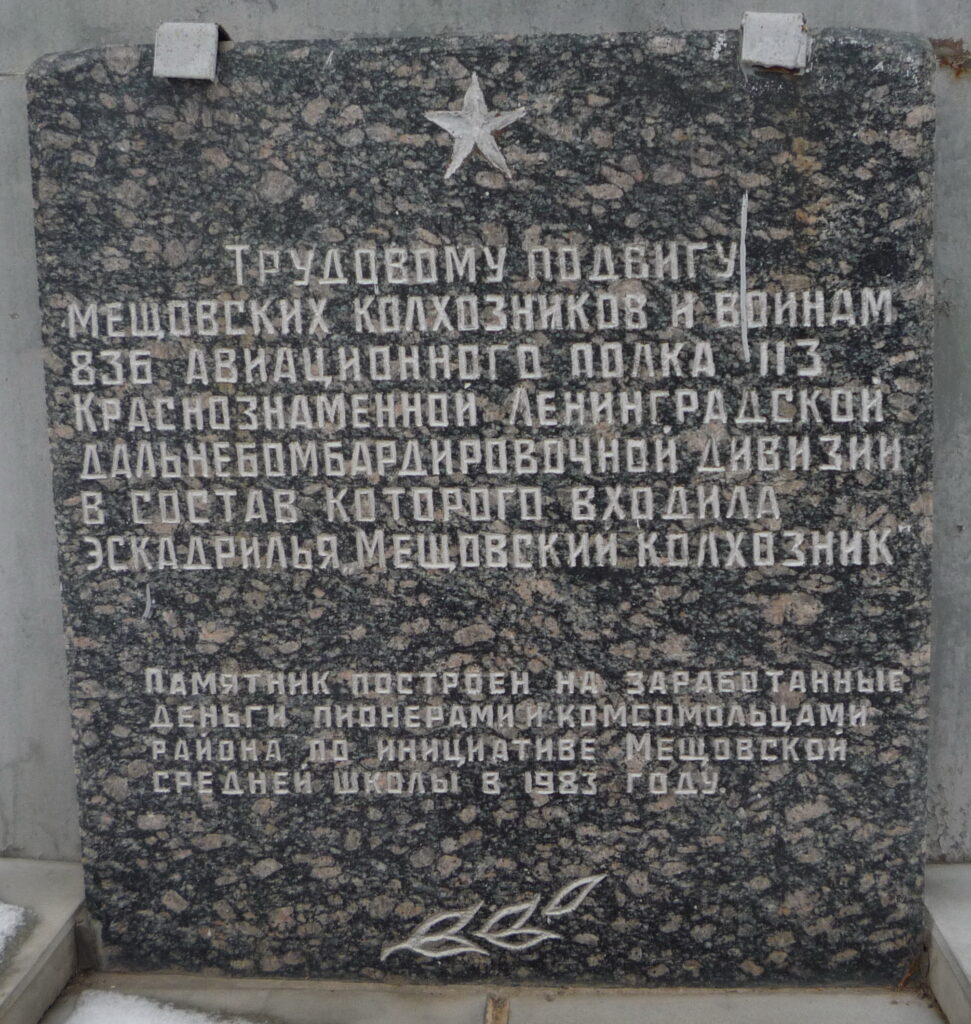 На небольшом двухступенчатом постаменте, облицованном плиткой, установлена металлическая стела. На металлической стеле, устремлённой ввысь, укреплён макет самолёта-бомбардировщика «Ту-2С» «Мещовский колхозник». Высота стелы 10 м. На её лицевой стороне прикреплена мемориальная доска из чёрной гранитной крошки. На ней нанесена надпись: «Трудовому подвигу мещовских колхозников и воинам 836 авиационного полка 113 Краснознамённой Ленинградской дальнебомбардировочной дивизии, в состав которого входила эскадрилья «Мещовский колхозник». Памятник построен на заработанные деньги пионерами и комсомольцами района, по инициативе Мещовской средней школы в 1983 году».