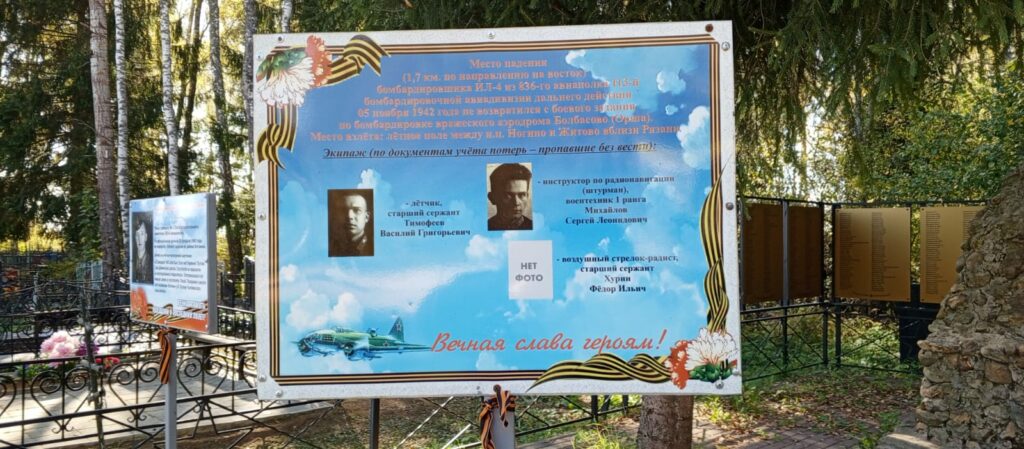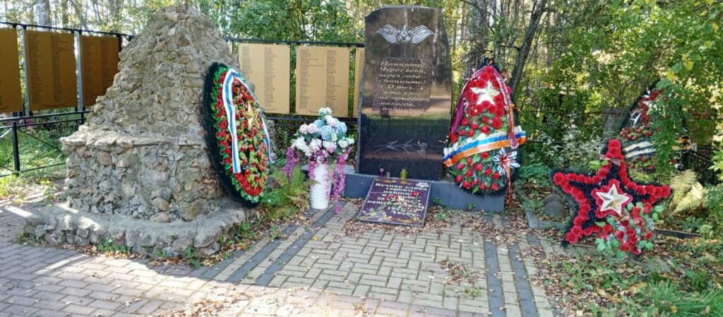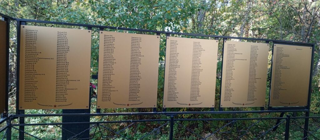 Сюда в 1970 году были перенесены останки советских воинов, похороненных в годы войны в небольших могилах вдоль трассы, а также из окрестных деревень.