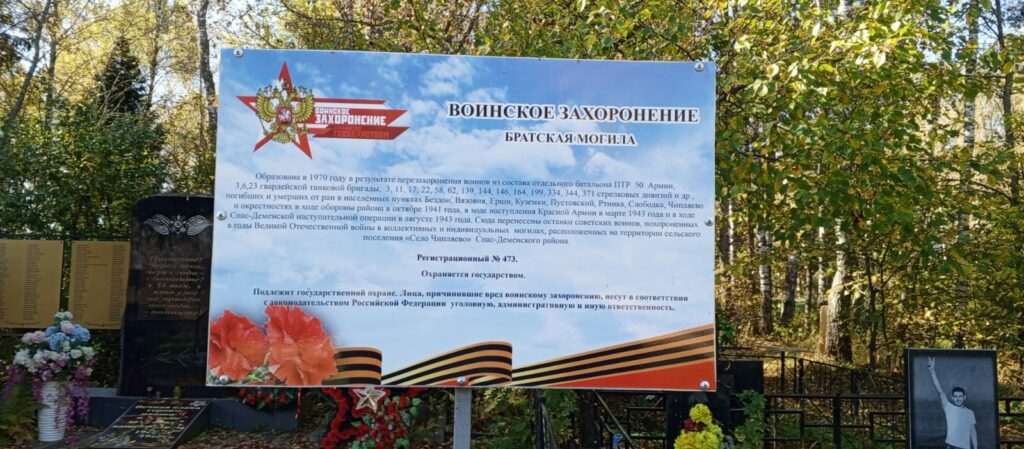 В честь 25 -летия Победы, к 9 мая 1970 г., силами учащихся и учителей Чипляевской средней школы был установлен памятник — из булыжников разного размера, скрепленных цементом, сооружена четырехугольная пирамида величиной 2,4 м х 2,6 м, увенчанная пятиконечной звездой. К лицевой стороне пирамиды прислонена каменная плита размером 1м х 0,65 м, на которой краской написано: «Вечная слава героям, павшим в борьбе за свободу нашей Родины в 1941 — 1945 гг.»