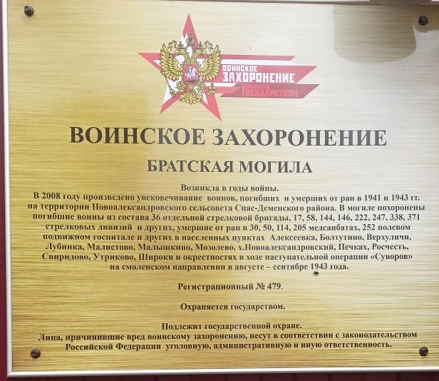 В 2008г. по решению Администрации муниципального образования «Спас –Деменский район» было произведено перезахоронение сюда останков погибших воинов из небольших братских могил в д.Алексеевке, Болтутине, Верхуличах,Выселках, Любинке, Малистове, Малышкине, Мозолеве, Печках, Росчести, Свиродове, Утрикове, Широках. Такое решение обосновывалось необходимостью организации надлежащего ухода за погребением советских воинов.