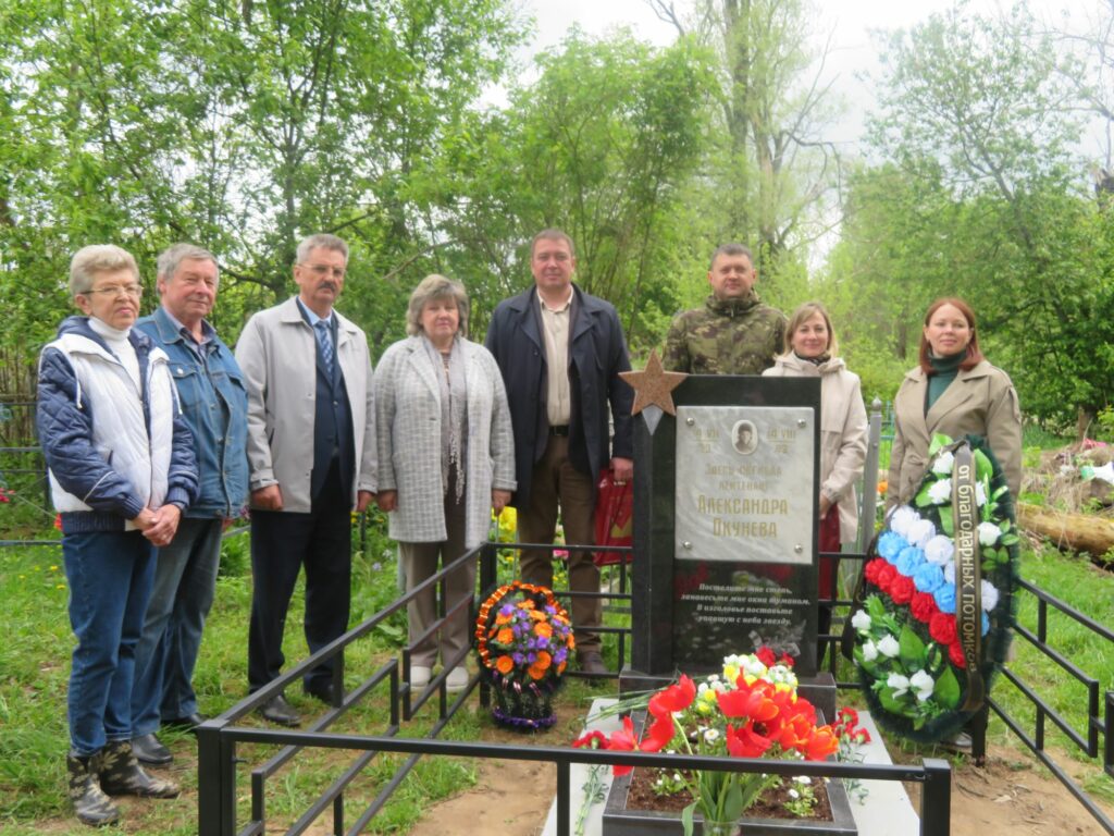 В 1986 году на месте ее захоронения была установлена мемориальная плита. Со временем надгробный памятник обветшал и требовал срочного ремонта. В год 80-летия Великой Победы в преддверии 9 мая работу по реконструкции и благоустройству места захоронения командира пулеметного взвода Александры Окуневой начали десногорцы. Они взяли шефство над могилой Шуры неслучайно, в годы Великой Отечественной войны Спас-Деменский район входил в состав Смоленской области.