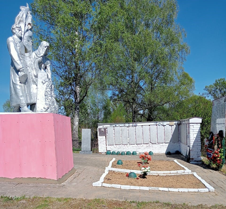 На постаменте установлена скульптурная группа из бетона – фигура воина со знамением и женщины, возлагающей венок. Высота скульптуры более 2-х метров. Под углом к памятнику установлена кирпичная мемориальная стена, на которой установлены мемориальные плиты с именами похороненных. Территория могилы обнесена металлической оградой.