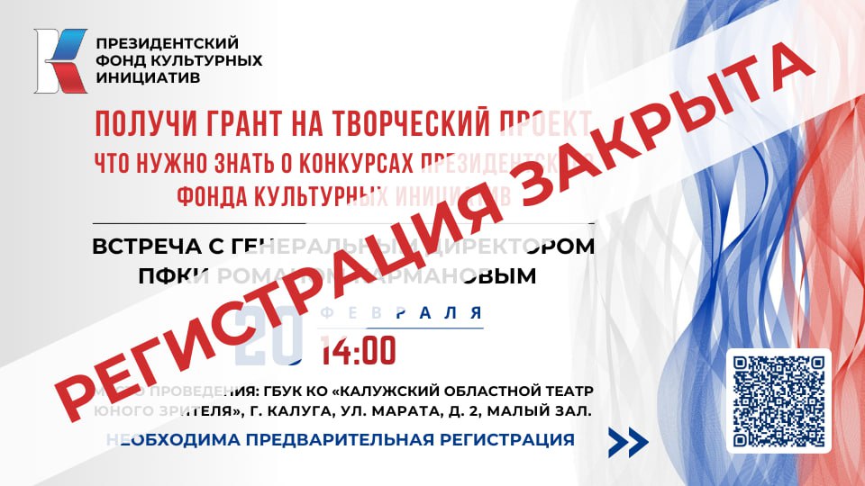 20 февраля в 14.00 в малом зале Калужского театра юного зрителя состоится встреча с генеральным директором Президентского фонда культурных инициатив Р. В. Кармановым «Получи грант на творческий проект. Что нужно знать о конкурсах ПФКИ».