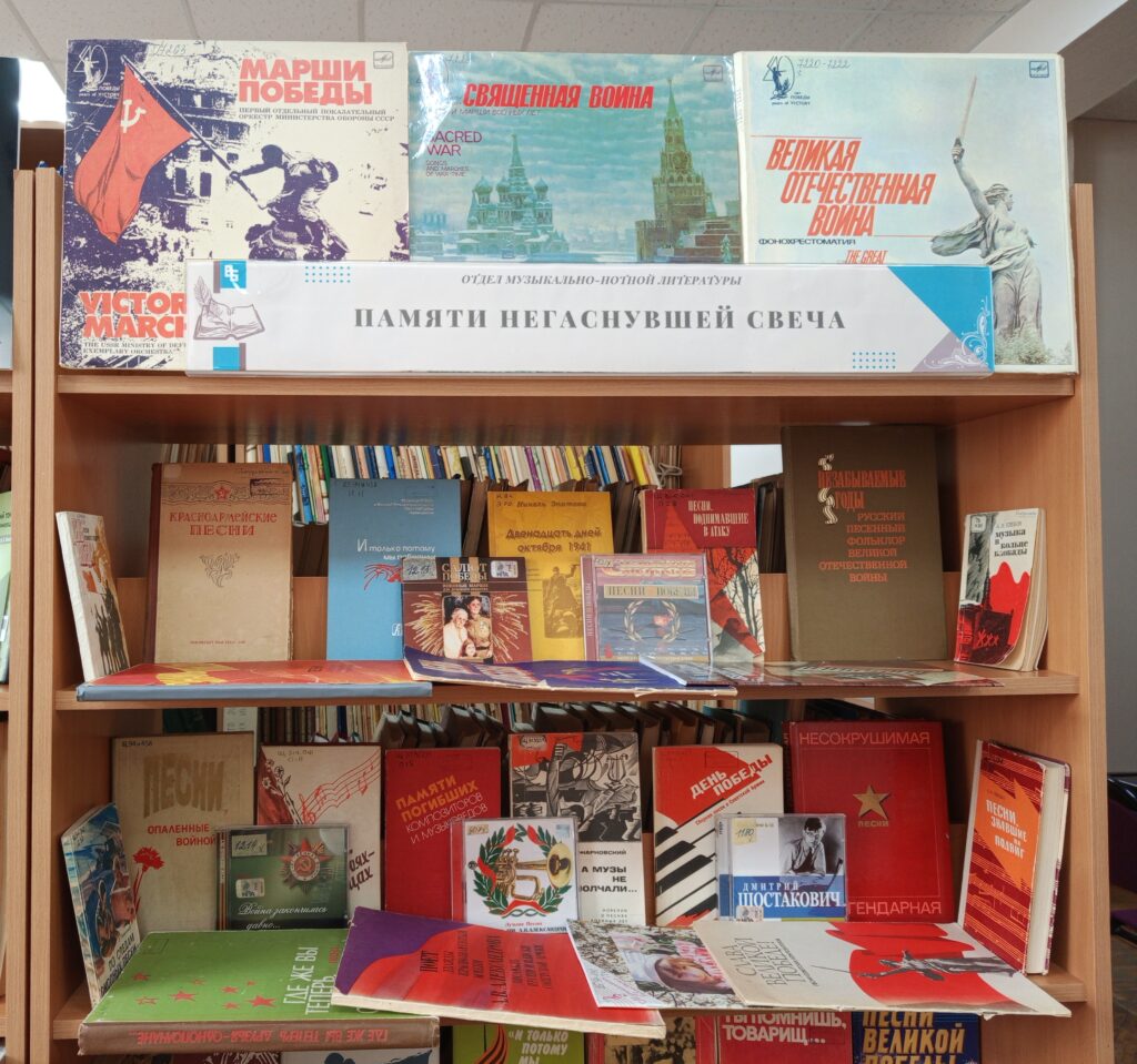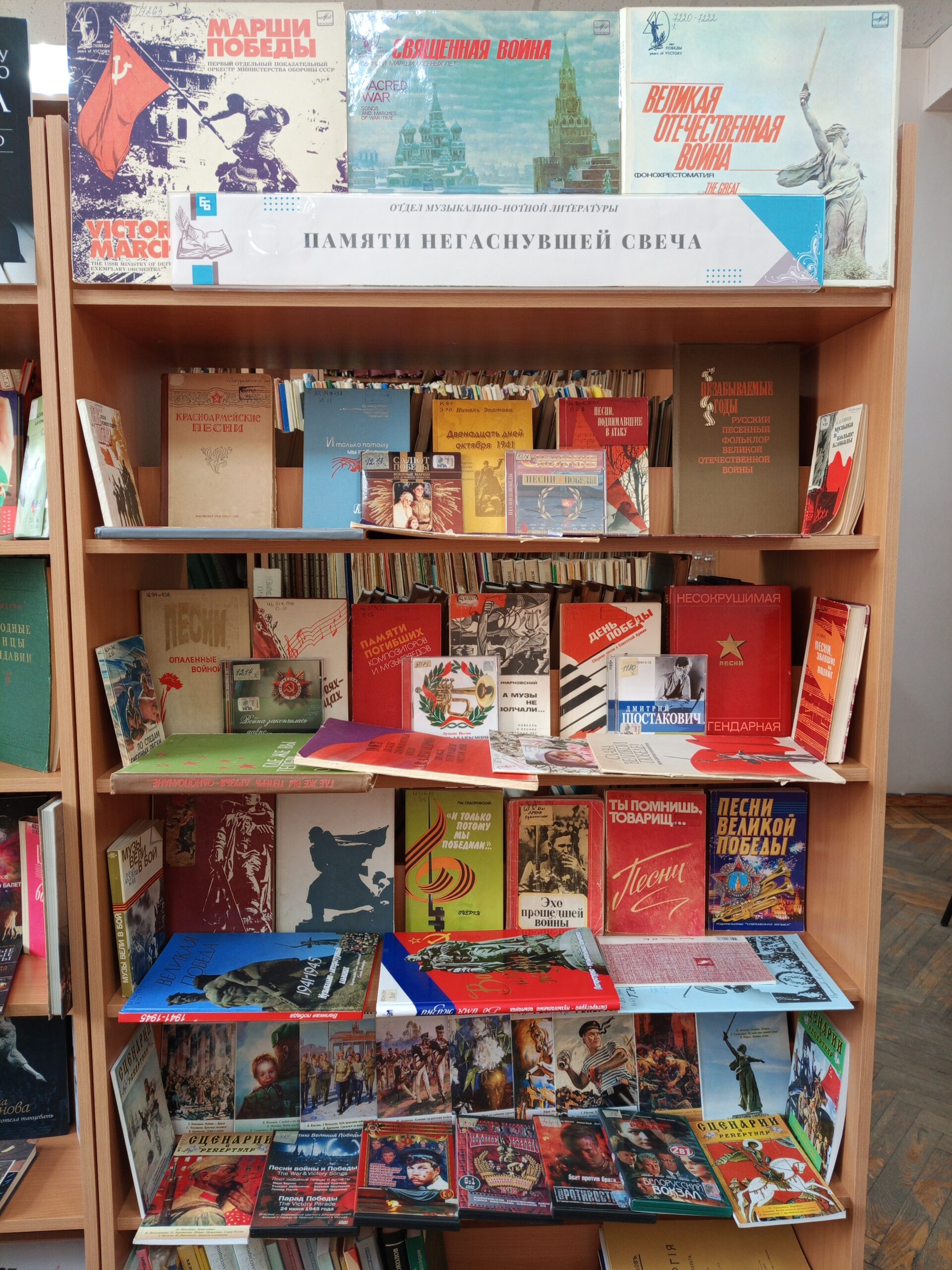 Как бы не отдалялись от нас годы битв с фашизмом, память о них, интерес людей к героическому прошлому не иссякают. В этом году все прогрессивное человечество 9 мая празднует 81-ю годовщину великой Победы. К этой дате музыкально-нотный отдел оформил выставку «Памяти негаснувшей свеча».