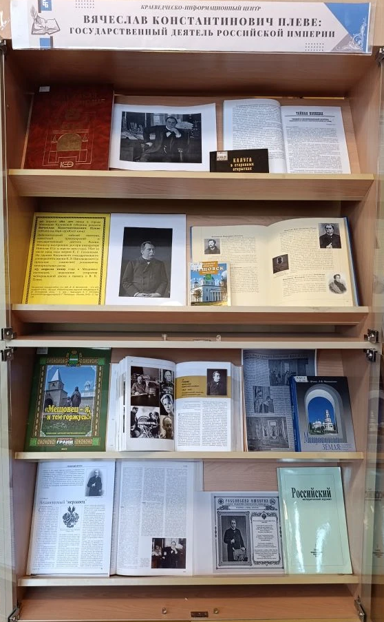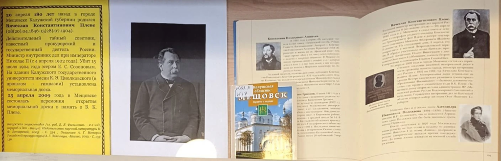 В Краеведческо-информационном центре открылась выставка, посвящённая 180 — летию со дня рождения Вячеслава Константиновича фон Плеве (8(20) апреля 1846 — 15(28) июля 1904) — российского государственный деятеля, статс-секретаря, сенатора, министра внутренних дел Российской империи в 1902–1904 годах. Его биография тесно связана с Калугой и Мещовском.