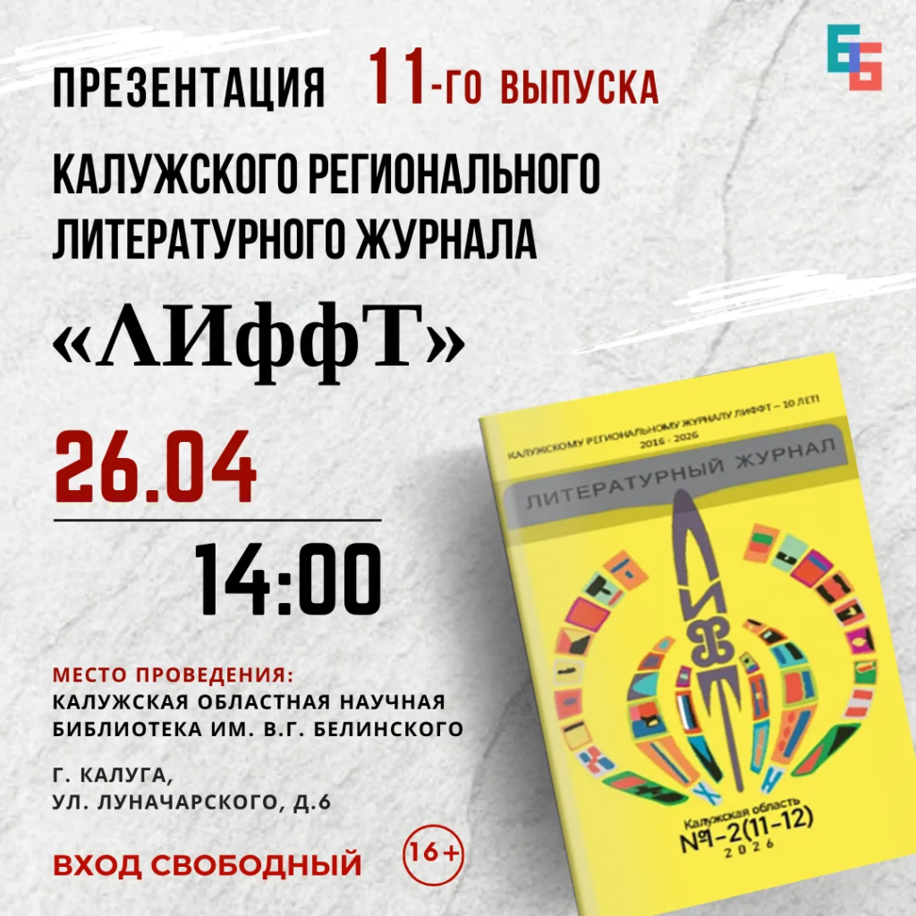 26 апреля в зале Губернаторской библиотеки состоится презентация 11-го выпуска калужского регионального литературного журнала «ЛИффТ». Выход данного номера знаменует собой юбилейный факт — десятилетие успешного существования в нашем регионе Всероссийского литературного проекта «ЛИффТ», организованного в 2016 году поэтом-авангардистом, философом и художником Маргаритой Аль. За эти годы в калужском журнале «ЛИффТ» было опубликовано 140 авторов (из них 11 поэтов-фронтовиков Великой Отечественной войны) из всех 24 районов и двух городов областного значения Калужской области.