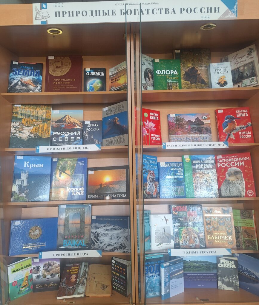 На 3-ем этаже библиотеки открыта книжно-иллюстрированная выставка-путешествие «Природные богатства России», представленная отделом медицины и экологии.