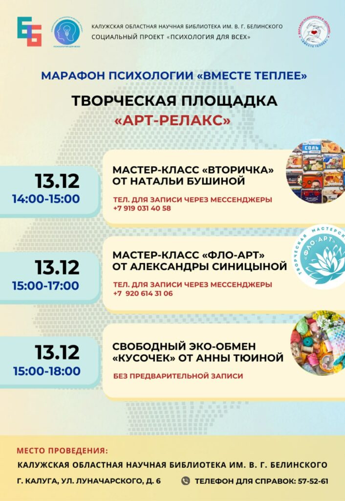 Друзья! Мы приготовили для вас очень насыщенную и разнообразную программу в эту субботу 13 декабря в рамках Марафона психологии «Вместе теплее», которую назвали «Арт-релакс».