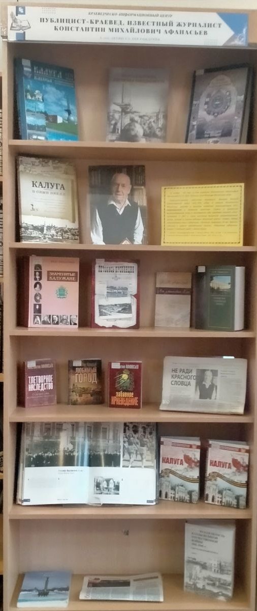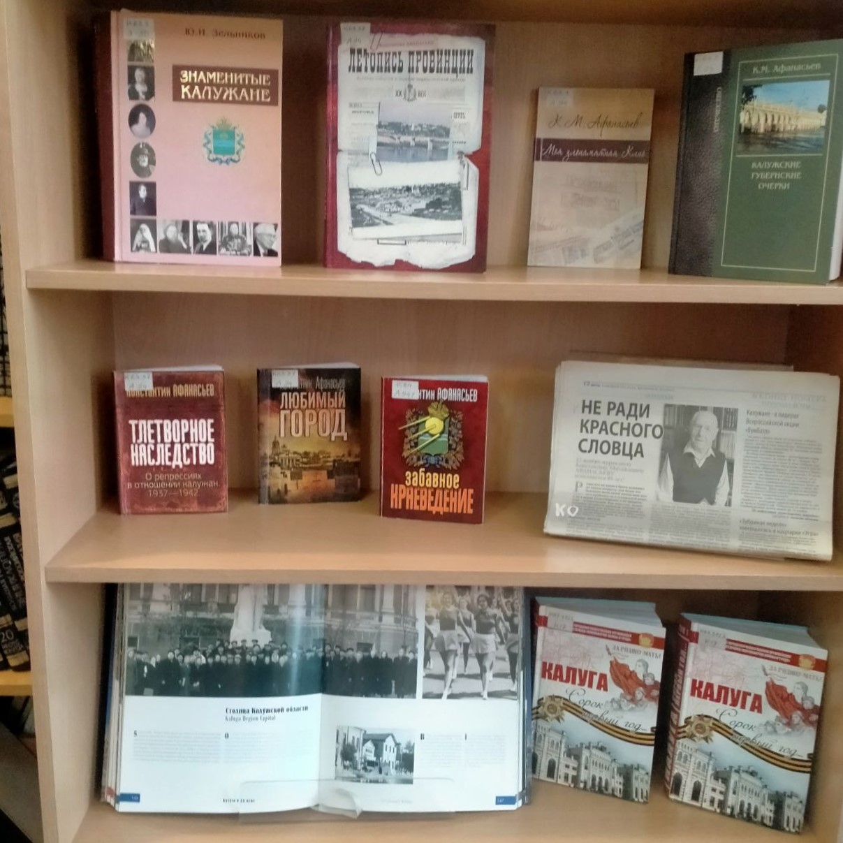 Константин Михайлович Афанасьев — автор ряда книг, в числе которых «Калужские губернские очерки», «Любимый город», «Тлетворное наследство: о репрессиях в отношении калужан, 1937–1942», «Зеркало заднего вида», «Забавное краеведение: фельетоны разных лет». Темы творчества Константина Михайловича Афанасьева (журналиста, писателя, краеведа) связаны с историей Калужской губернии и области. Все эти книги представлены на выставке.