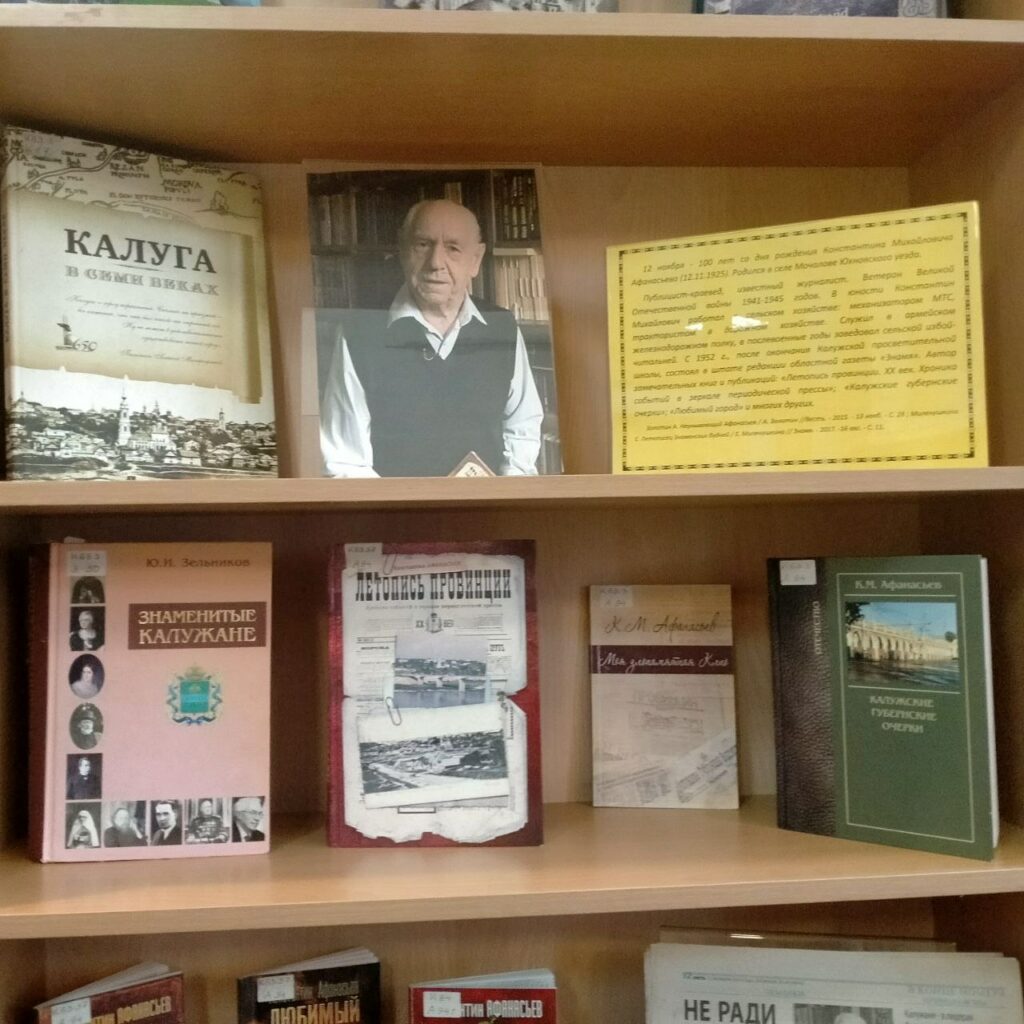 Краеведческо-информационном центре открылась выставка «Публицист-краевед, известный журналист Константин Михайлович Афанасьев», приуроченная к 100-летию со дня его рождения. Константин Михайлович — один из старейших журналистов и писателей Калужской области, ветеран Великой Отечественной войны. Родился 12 ноября 1925 года в селе Мочалово Юхновского уезда Калужской губернии. В молодости трудился в аграрном секторе: был механизатором в МТС и трактористом в дорожном хозяйстве. Служил в армейском железнодорожном полку. В послевоенные годы заведовал сельской избой-читальней.