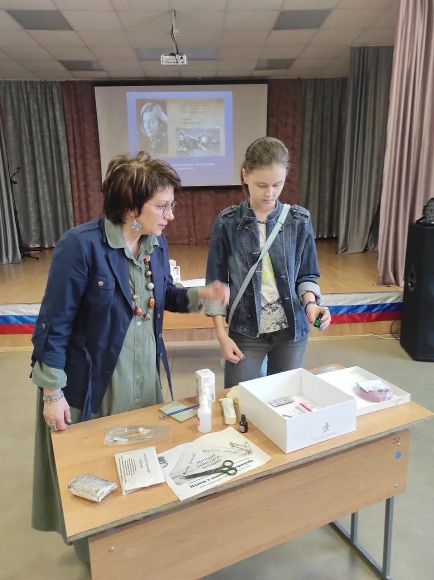 В завершении ребята выполнили интерактивное задание, постаравшись собрать сумку военного санинструктора из предложенных предметов. Нужно сказать, что справились они с заданием довольно успешно.