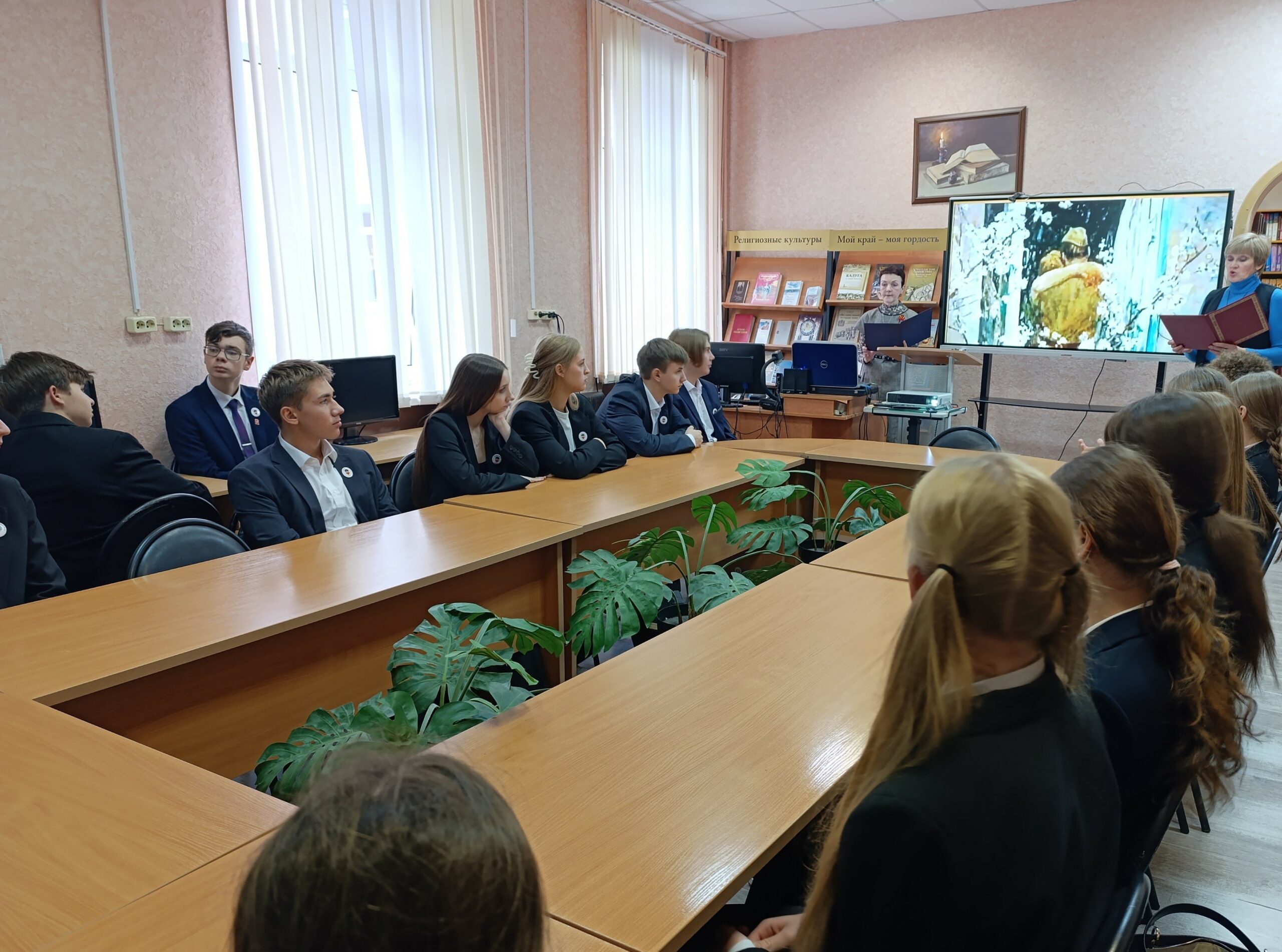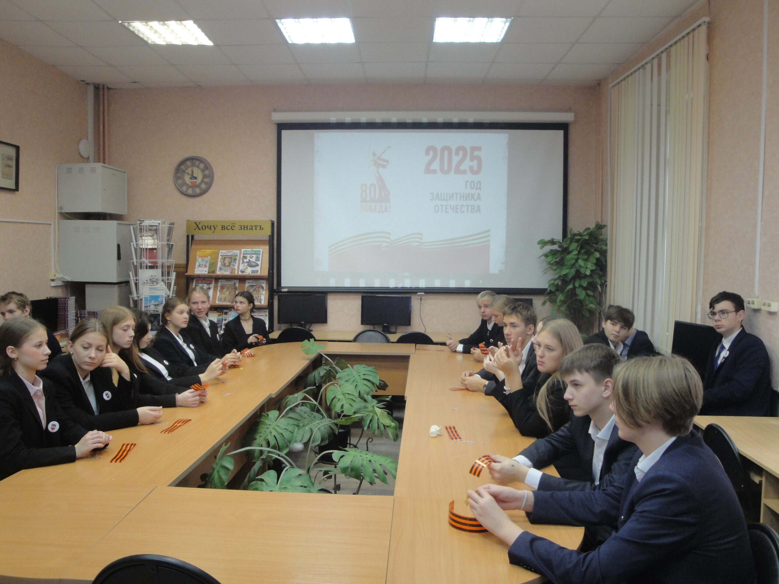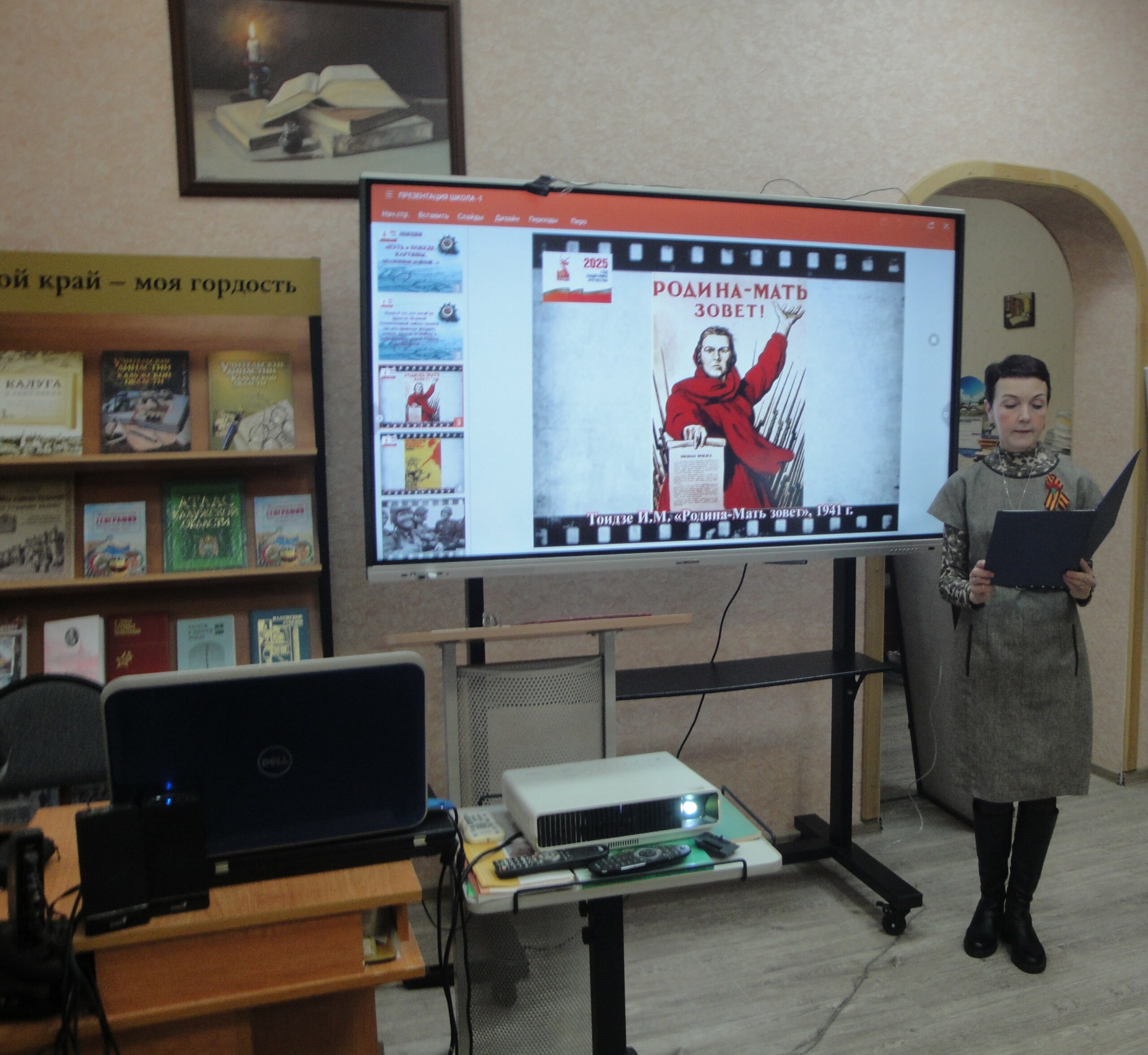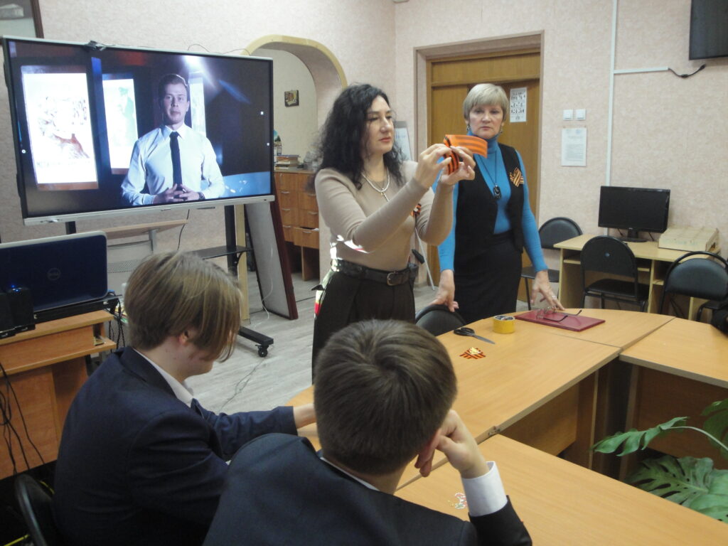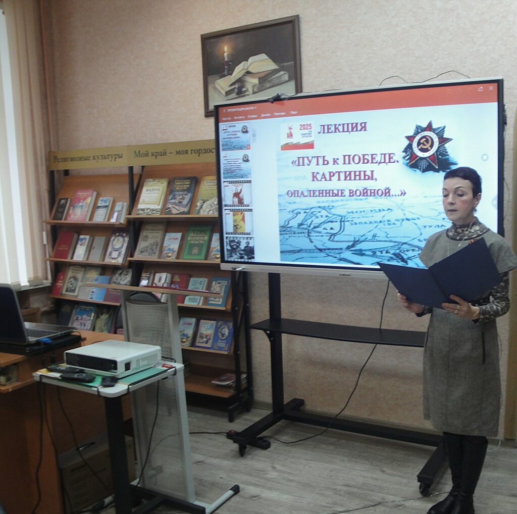 В рамках реализации Всероссийского проекта «Пушкинская карта», для учащихся МБОУ «Гимназия №24» г. Калуги сотрудники библиотеки провели комплексную тематическую программу, которая включила в себя лекцию «Путь к Победе. Картины, опаленные войной» + мастер-класс «Изготовление значка – символа Победы «Красная гвоздика». Мероприятие было разработано с учетом 80-летия Великой Победы и текущего Года защитника Отечества.