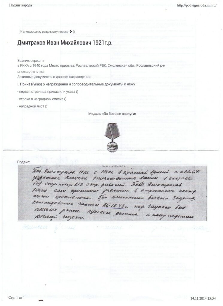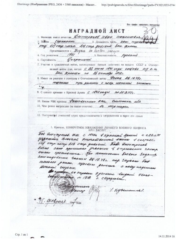 Мой дедушка по маминой линии родом из Красного Хутора Мокровского сельского совета Куйбышевского района. Закончил 7 классов, поступил учиться в Рославльский медицинский техникум по специальности фельдшер. В 1940 году призван Рославльским РВК Смоленской обл. Рост – 180 см. Там его и застала война, оттуда он ушёл на фронт, в звании сержант. Был командиром пулемётного отделения 669 стрелкового полка 212 стрелковой дивизии Западного фронта. С 22 июня 1941 года по 25 октября 1943 года лично принимал участие в отражение контратаки противника. При выполнении боевого задания, 25.10.1943 г. под Чаусами был тяжело ранен разрывной пулей в лицо.