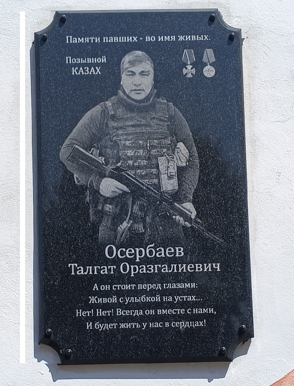 9 мая 2024 года у стелы «Рубеж воинской доблести» состоялось торжественное открытие мемориальной доски воину, погибшему при исполнении воинского долга в ходе специальной военной операции — Осербаеву Талгату Оразгалиевичу. На митинге говорили о том, как важно защищать родную землю, быть настоящим патриотом страны, помнить о героях-земляках. «Сегодня меня переполняет чувство гордости за то, что среди нас жил человек, не побоявшийся трудностей и ушедший добровольцем на защиту Родины, и чувство благодарности ему за совершенный подвиг. Думаю, что он будет вечно жить в ваших сердцах», – сказала глава СП «Село Ильинское» Чистякова В. С. Глава районной администрации Парфенов В. В. отметил, что собравшиеся на митинге чествуют не только память бойца, отдавшего жизнь за нашу свободу, но и подвиг всех парней, защищающих нашу землю. Они продолжают славную традицию служения Родине наших дедов. Много добрых слов сказала о своем брате сестра погибшего — Яблонцева Ж. О. Присутствующие возложили цветы и почтили память мужественного земляка минутой молчания. Односельчане всегда будут помнить о самоотверженности, верности воинскому долгу и доблести воина.