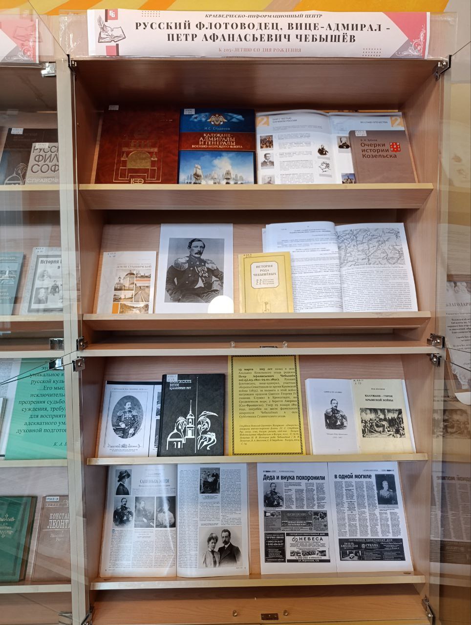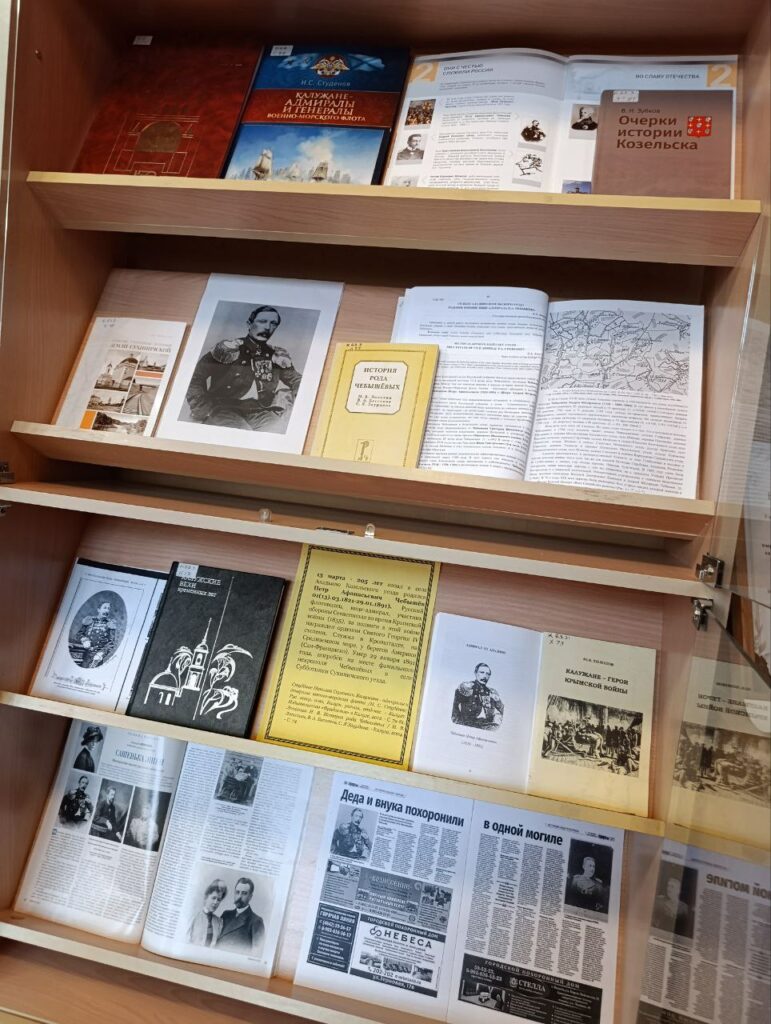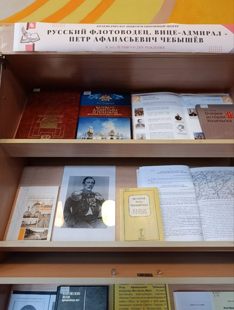 На выставке в Краеведческо-информационном центре представлены статьи и книги, посвященные судьбе русского офицера Петра Афанасьевича Чебышёва. В частности, его жизнь и деятельность описаны в книге Юрия Васильевича Холопова «Калужане-герои Крымской войны», выпущенной в Калуге в 2008 году. Это издание рассказывает о судьбах соотечественников, которые служили в Российском флоте во время Крымской войны 1853–1856 годов.
