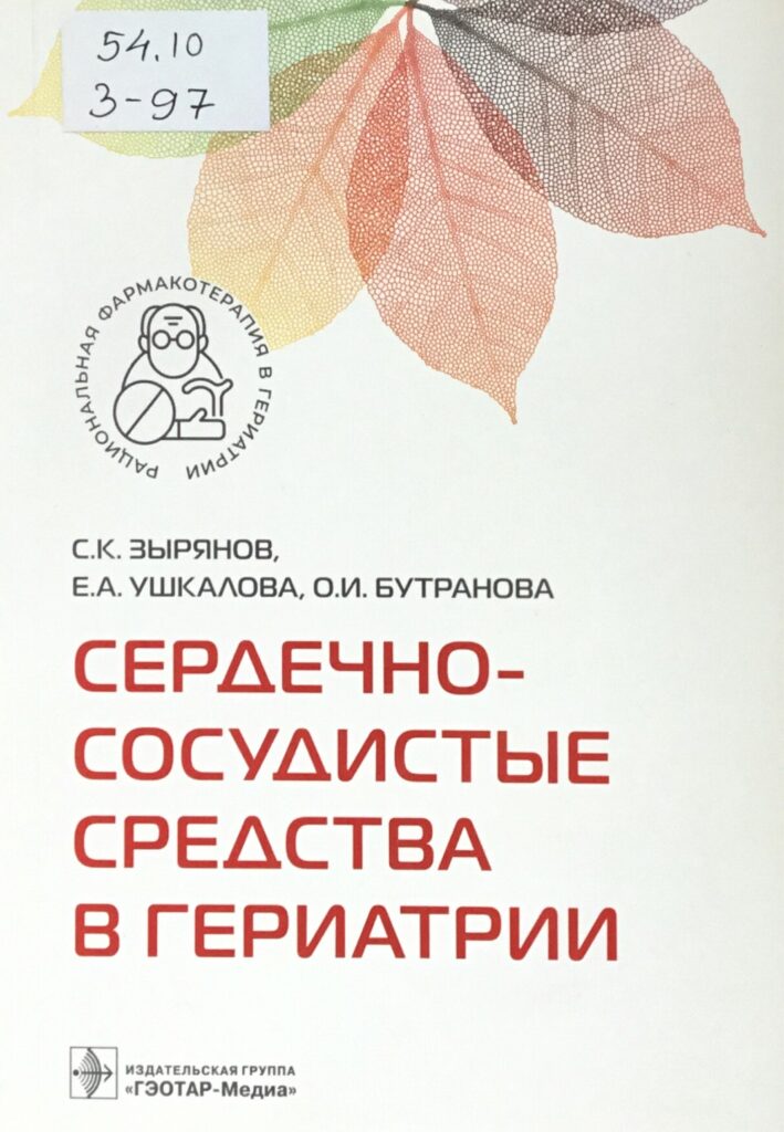 2.Зырянов, Сергей Кенсаринович. Сердечно-сосудистые средства в гериатрии : учебное пособие для использования в образовательных учреждениях, реализующих основные профессиональные образовательные программы высшего образования — программы специалитета по направлению подготовки 31.05.01 «Лечебное дело» / С. К. Зырянов, Е. А. Ушкалова, О. И. Бутранова. — Москва : 2023. — 222, [1] с., [4] л. цв. ил. ; 21 см. . — ISBN 978-5-9704-7527-0 .