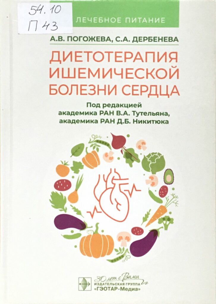 4.Погожева, Алла Владимировна. Диетотерапия ишемической болезни сердца / А. В. Погожева, С. А. Дербенева ; под редакцией В. А. Тутельяна, Д. Б. Никитюка. — Москва : ГЭОТАР-МЕДИА, 2024 . — 230, [1] с. : ил. ; 22 см. — (Лечебное питание). — Библиография: с. 225-226. — Предметный указатель: с. 229-231. — ISBN 978-5-9704-8066-3