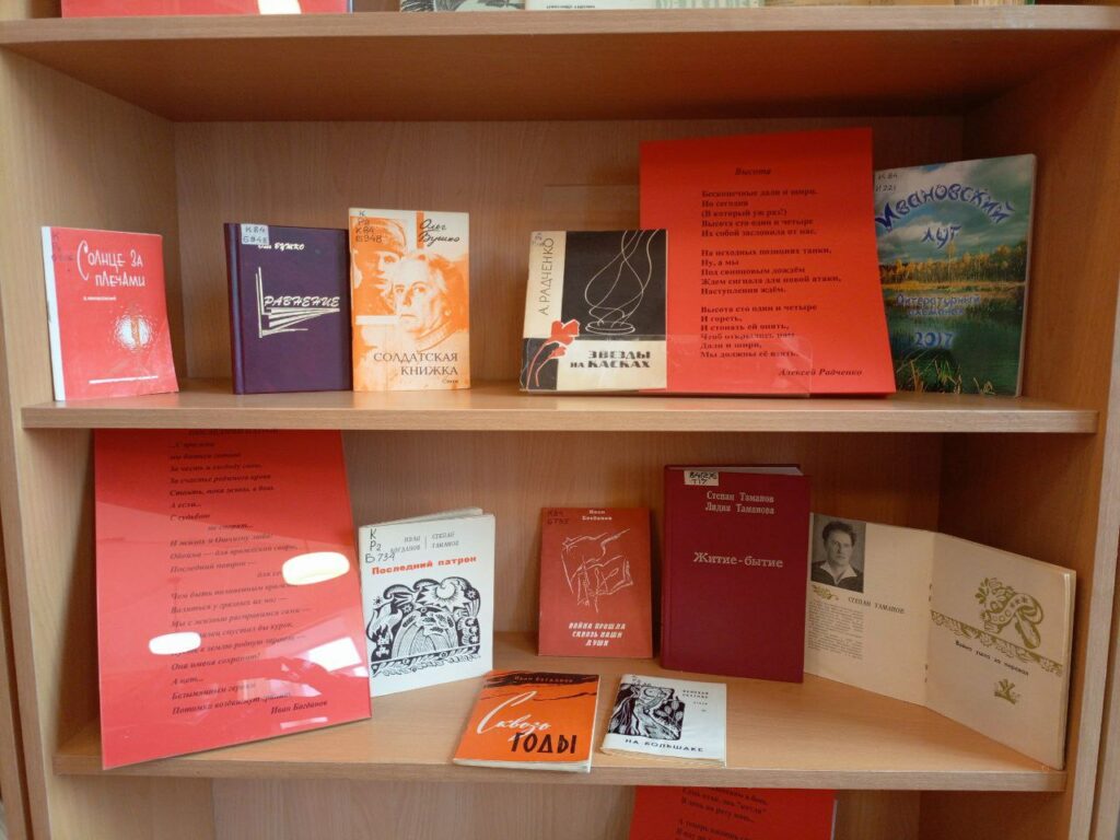 На выставке представлены издания, в которых опубликованы произведения, поэтов-калужан воевавших на фронтах Великой Отечественной войны и отразивших в своём творчестве события тех лет. Среди них — произведения А. Авдонина, Н. Полунина, Н. Панченко, А. Радченко, С. Таманова, И. Богданова и других авторов. Их стихи передают подлинную атмосферу военных лет, боль потерь, радость побед и несгибаемую веру в мирное будущее.