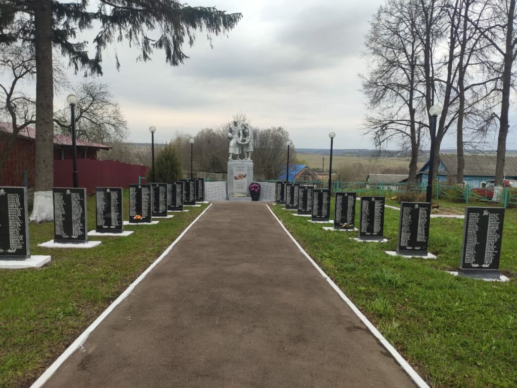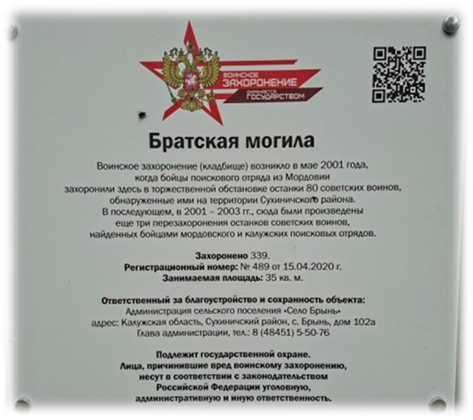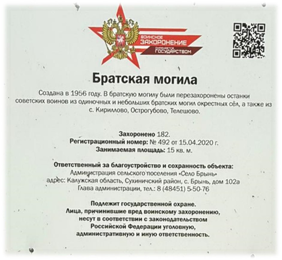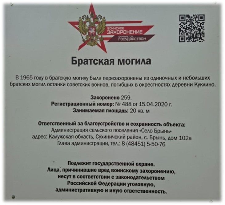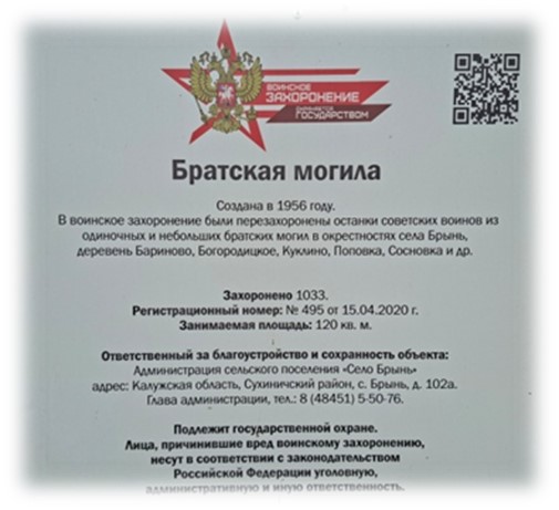 Воинское захоронение, состоящее из двух могильных холмов размером каждый 2 м х 3 м, находится в центре села, возле церкви. Оно возникло в 1956 г., когда здесь были перезахоронены останки советских воинов из одиночных и небольших братских могил в окрестностях с.Брынь, а также в Баринове, Богородицком, Куклине, Поповке, Сосновке и др. На железобетонном фундаменте находится железобетонный постамент площадью 1,1 м х 1,5 м и высотой 2 м, на котором установлена скульптурная группа – воины мужчина и женщина с обнаженными скорбно опущенными головами держат венок. У солдата в правой руке каска. Высота скульптурной группы – 2,5 м. На лицевой стороне постамента укреплена металлическая доска с надписью: «1941 – 1945 гг.». Над доской изображена пятиконечная звезда. Под доской – надпись: «Вечная слава героям, павшим в боях за свободу и независимость нашей Родины в Великой Отечественной войне». По обеим сторонам постамента установлены мемориальные плиты шириной 1,5 м и высотой 1 м, на которых увековечены имена земляков, погибших на разных фронтах страны. Перед памятником – обрамленный бордюром газон и асфальтированная дорожка. По обеим сторонам – по семь железобетонных плит, установленных каждая на двухступенчатом стилобате. На плитах высечены имена похороненных здесь воинов. На территории захоронения разбиты клумбы. Общая площадь захоронения 10 м х 12 м обнесена металлической оградой.