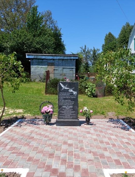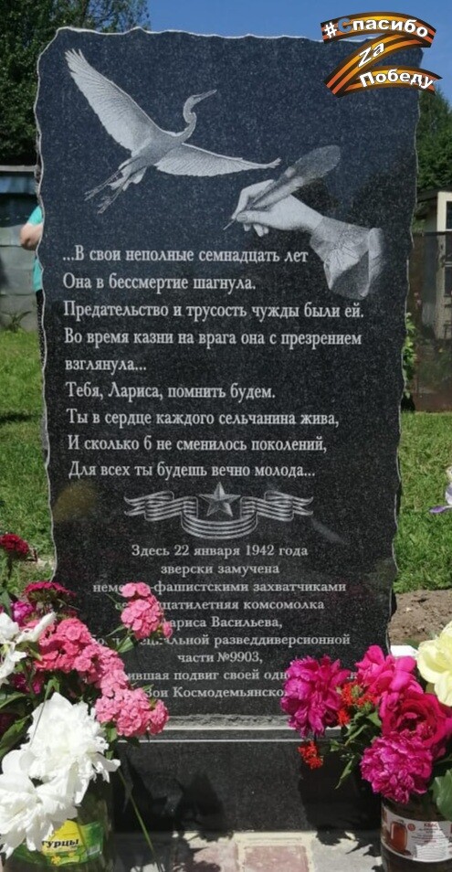 «Здесь 22 января 1942 года зверски замучена немецко-фашистскими захватчиками семнадцатилетняя комсомолка Лариса Васильева, боец специальной разведдиверсионной части № 9903, повторившая подвиг своей однополчанки Зои Космодемьянской».