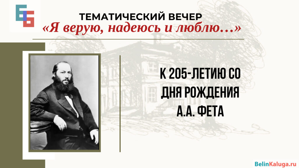 4 ноября в библиотеке пройдет тематический вечер «Я верую, надеюсь и люблю…»,  подготовленный в рамках празднования 205-летия со дня рождения А.А. Фета.